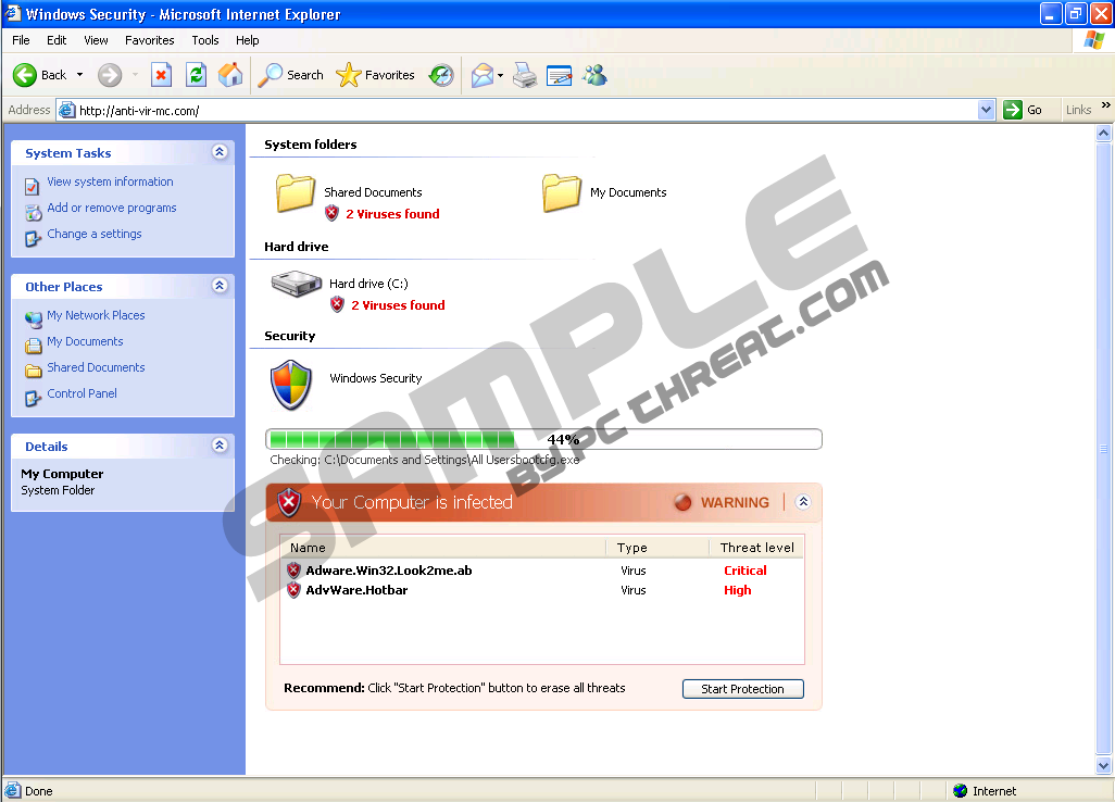 Anti-vir-mc.comWith all of the time and effort invested in fake security websites and applications these days it is becoming increasingly more difficult to distinguish the fakes from the real McCoy, as in the case of Anti-vir-mc.com. This seditious browser hijacker forms an integral part of the online marketing campaign of well known and highly despised rogue security application System Tool. Nothing good can come from visiting this corrupt domain, and it therefore follows that all literature contained on this site should be accepted as critically suspect and unreliable. The entire Anti-vir-mc.com was designed to trick consumers out of their money. Anti-vir-mc.com will forcefully redirect the user to its compromised landing pages, where it will start its campaign against the system. Once there, the user’s system and browser weaknesses are exploited so as to allow the System Tool Trojan to root itself in the system. Anti-vir-mc.com also makes use of established drive-by download tactics to compromise users’ PCs. The Anti-vir-mc.com will instigate a fake system scan and produce various false positives informing the PC owner that his system is compromised. It will report among other infections that the user’s system is infected with Adware.Win32.Look2me.ab, and AdvWare.Hotbar, threat levels Critical and High respectively. Because the file names are indiscernible for the average computer user, Anti-vir-mc.com reckons it will be able to successful in stressing the user into believing its blatant lies. This hijacker makes use of genuine looking Microsoft GUIs in an effort to further secure its seemingly genuine looking appearance. This is part contributes to making it more difficult to identify Anti-vir-mc.com as the fake and malicious website which it actually is. At the end of the day no correspondence received from Anti-vir-mc.com can be trusted. It is up to you to invest in powerful and properly functioning security tools which will be able to identify and remove Anti-vir-mc.com Trojans and similar malware, and thus ensure the good workings of the system. |