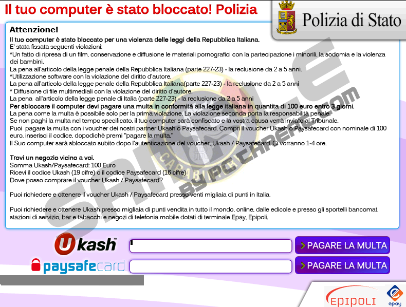 Polizia Di Stato VirusUnprotected computers are always susceptible to multiple computer threats, and Polizia Di Stato Virus is one of ransomware infections which has been released in Italy to trick Italian-speaking computer users. The virus injects its codes into the Registry so that the desktop becomes inaccessible, which means that you cannot browse the Internet and do your everyday tasks or activities. Alongside the immobility of the system, the virus displays a message claiming that the computer is disabled because the police have investigated that the machine contains child pornography. To unlock it, the owner has to pay a fine of 100 EUR; however, as the message is created by cyber crooks, the requirement given in the message must be ignored. National Italian Police would never use this kind of method to prosecute criminals; therefore, ignore the fact that you are expected to pay the ransom either through Ukash or through Paysafecard even though these paying methods are legitimate. All that you need to do in the case of Polizia Di Stato Virus is to remove it by using a legitimate spyware removal tool which is also powerful enough to terminate this cunning infection. Keep in mind that the virus is one of many viruses related to Ukash ransomware infections such as Northern Constabulary E-Crime Unit virus, Bundesamt für Polizei virus and others. There are some cases when the virus has more than one version used to infect computers in a particular region. If you remove Polizia Di Stato Virus with a reliable tool that can protect the computer, you will avoid possible ransomware attacks in the future; this is why we recommend that you use SpyHunter, which will remove Polizia Di Stato Virus and guard the PC. To download this tool, follow our instructions provided: 1.Reboot the PC and hit the F8 button while the PC is restarting. Windows XP users: 1.Repeat steps 1 and 2 given above. |