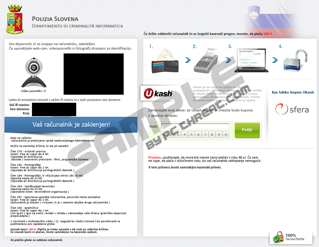 Polizia Slovena RansomwarePolizia Slovena Ransomware is a computer infection aimed at deceiving unsuspecting computer users that browse the Internet carelessly and do not think about possible consequences. This piece of ransomware may get onto the computer after downloading infected software or a spam email attachment or while browsing a corrupted website. If you have an anti-virus program on your PC and you find that your computer suddenly becomes locked, it means that your security tool is not powerful enough to fight this infection off, which is why you should use a powerful spyware removal tool as well. Not only does Polizia Slovena Ransomware paralyze the computer, but it also displays a misleading message claiming that the computer is locked because the machine has been used to distribute copyrighted files or material of a pornographic nature. Even though the message presents possible prosecutions for the alleged crimes, the user is provided with a “chance” to avoid future problems by paying a fine of €100 via Ukash, which should not be done, because it is enough to remove Polizia Slovena Ransomware from the system. Polizia Slovena Ransomware is one of Ukash viruses that paralyze computers in an attempt to deceive unsuspecting computer users. Some other viruses that are attributed to this ransomware infection group are Slovenská Polícia Virus, Europol Ransomware Virus and Police on Web Virus, which should be removed immediately. All of the virus that are known as the Ukash viruses demand that the ransom money be paid through Ukash, or less frequently through Paysafecard. These services should never be trusted when they appear in a form of a message, because safe money transfers are made only in websites. Now as you know that you should remove Polizia Slovena Ransomware as soon as possible, follow our instructions that will help you download and install SpyHunter, which will delete the infection for you: Windows Vista/7: 1. Restart the computer and press the F8 button while the PC is restarting. Windows XP: 1. Restart the PC. |