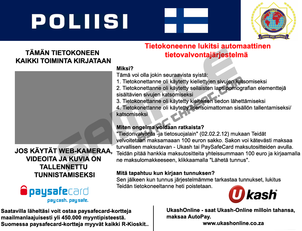 Poliisi virusIf your computer screen is occupied by a message saying Tietokoneen on lukituu!, your computer is infected with Poliisi virus, which you should remove immediately. Poliisi virus is a ransomware infection which attempts to persuade computer users to pay a ransom fee which is said to be necessary in order to have the computer unlocked. In addition to the sum of 100 euros which is required to be paid through Paysafecard or Ukash, the message displayed by the virus claims that the user has violated some laws. He/she is accused of viewing pornographic content or using copyrighted programs or files, which is said to be reason why the computer is now inoperable: Artikla 274- Tekijänoikeus Sakko tai vankeusrangaistus enintään 4 vuotta (Tekijänoikeuden suojaaman tiedoston — elokuvien ja ohjelmien - käyttö tai jakelu) It has been observed that there are three version of the interface of the virus; however, even though they differ a little, the reason why they have been produced is the same. Not surprisingly, there are many different ransomware infections containing credentials of different law enforcement agencies. Some of them are known as BSA virus, Federal Computer Crime Unit Virus, Latvijas Policijas Virus, etc. As you can see, different authoritative institutions are presented in simulated message. In the case of Poliisi virus, computer users are supposed to get scared by the Finnish police. Disregard the information provided, and remove Poliisi virus from the system; otherwise the computer will remain frozen, and you will not be able to use it at all. To remove the virus and prevent future occurrence of infection, use SpyHunter, which is very easy to use. The anti-spyware software is a powerful tool which will remove Poliisi virus and other infections from the system. However, in order not to get the application blocked by the infection, some changes in the settings have to be made before installing it. Below you will find our instruction which will help you to install the SpyHunter. Windows Vista/7: 1. Restart the computer. Windows XP: 1. Restart the PC and start tapping the F8 key once the BIOS screen disappears. If the Windows logo appears, restart the PC and try again. |