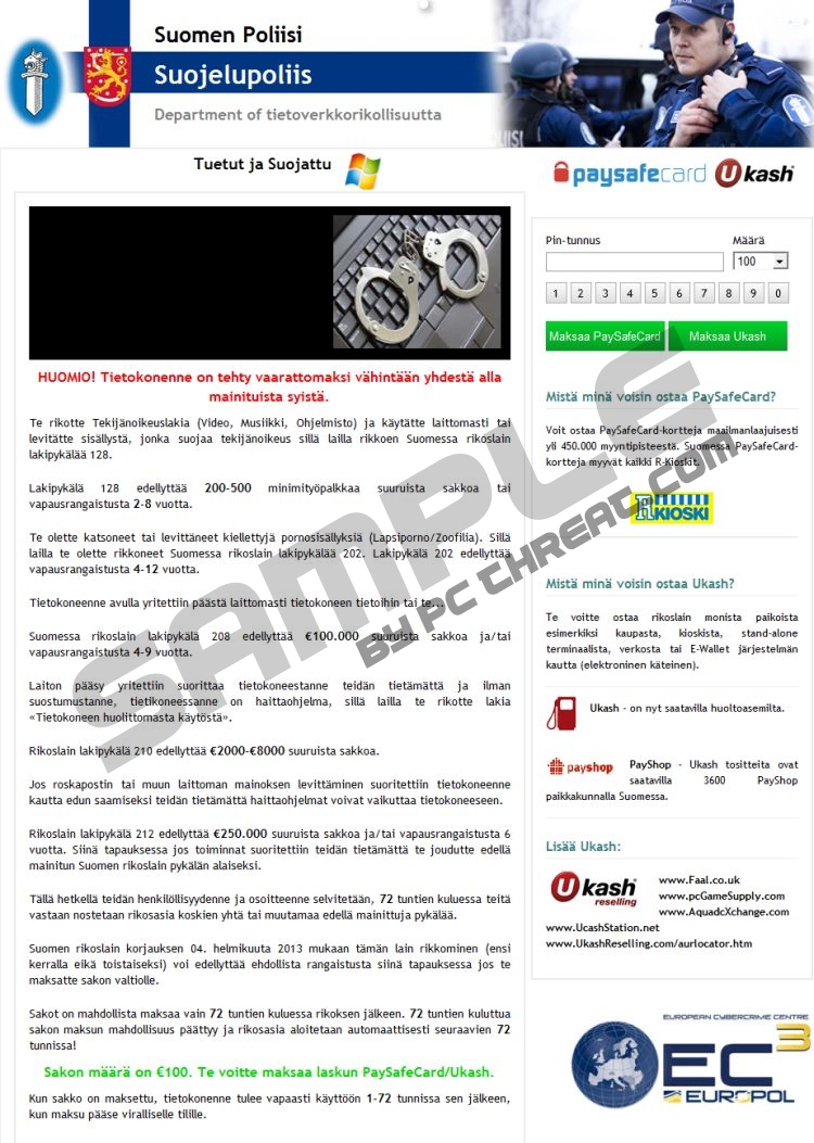 Suomen Poliisi VirusThe newest group of Ukash Virus group threats proves that ransomware infections are not going anywhere in 2013. Suomen Poliisi Virus is a malicious program that attacks users in Finland, and tries to steal their money by convincing them, that they have to pay a fine in order to unlock their computers. Suomen Poliisi Virus claims that the Finnish Police office has locked down a compromised computer, because the user has been engaged in illegal cyber activities. The infection presents a long list of supposed offenses in a screen-sized message that blocks user from accessing his desktop. You can an excerpt of the said message below: