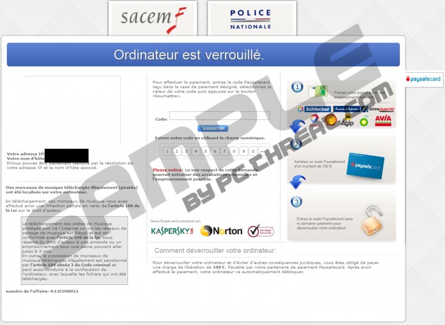 Ordinateur est Verrouillé virusIf your computer has been infected by the vicious Ordinateur est Verrouillé Virus, access to the computer desktop is now removed and you cannot do anything else but stare at an alert supposedly sent to you by the French Police. Do you feel suspicious towards this strange screen-locking notification? Well you should because real Police Nationale departments would never block your PC and ask you to pay fines through Paysafecard. If your computer has not been locked by authentic law enforcement agencies – who should you blame? Have no doubt that the vicious infection has been activated on the PC by cyber crooks, who expect you pay fines for allegedly performed crimes. Below is an excerpt from the fictitious notification; however, instead of paying attention to it, you should rush to delete Ordinateur est Verrouillé Virus. Continue reading to find out how to remove the ransomware from the PC.
