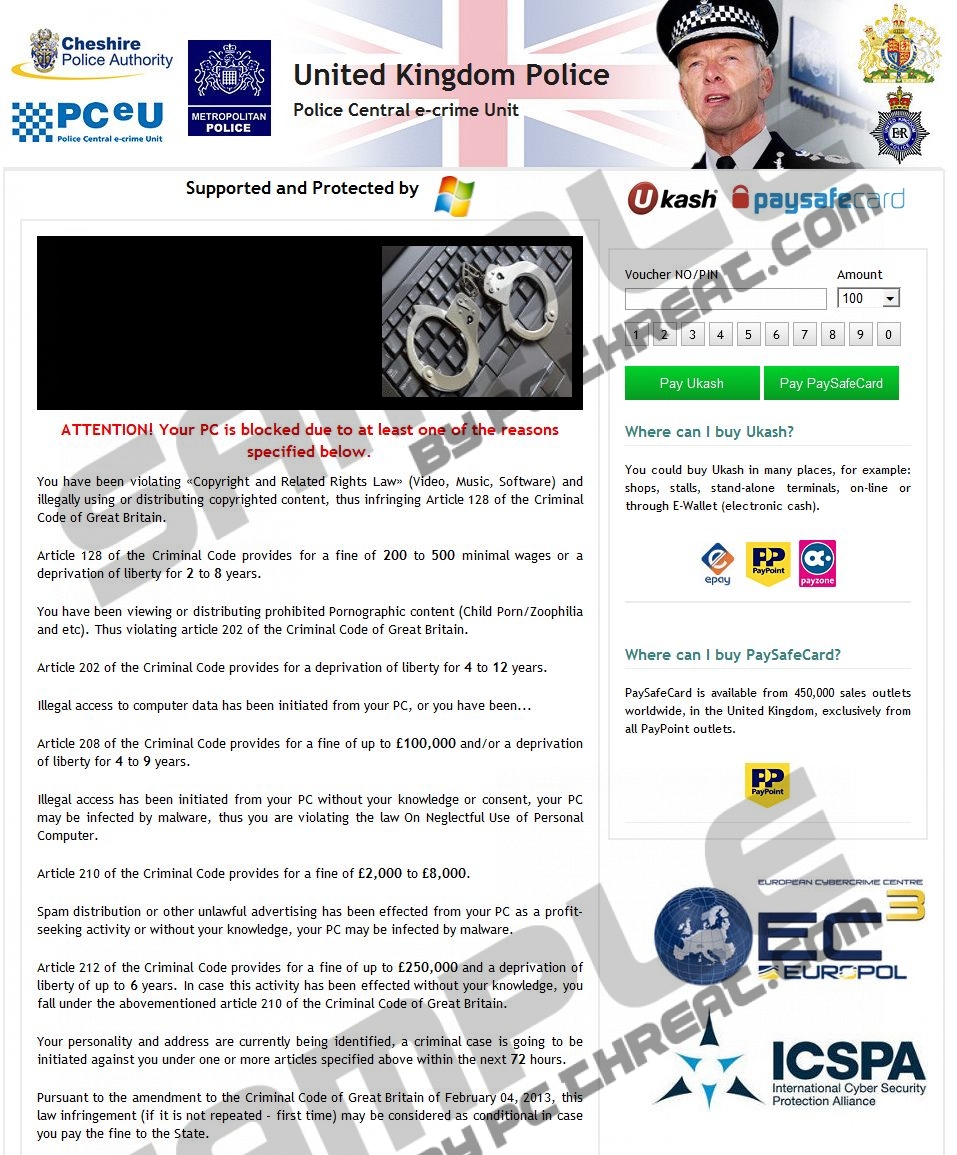 Police Central e-Crime Unit VirusPolice Central e-Crime Unit Virus is a ransomware infection which has at least six different versions and which is targeted at Windows users who live in Great Britain. Do you know what a ransomware virus is? The infection is presented as a screen-locking notification, supposedly sent to you by the PCeU or Police Central e-Crime Unit. Despite the credible lookinglogos, flags, emblems, names and other authentic credentials, you should not doubt that your PC has been locked by schemers and their malicious software. As research shows, ransomware programs are usually distributed by Trojans, including Epubb, CBeplay.P, Goldenbaks, Reveton or Urausy. Once one of these disturbing programs enters your PC via spam email attachments, bundled downloads and other security loopholes, it hijacks the Registry Editor and initiates the paralysis of a computer. Of course, Police Central e-Crime Unit Virus removal is something you should perform right away. Continue reading to find out how you can detect and delete infections running on the PC. Please see a few excerpts of the fictitious screen-locking notifications: