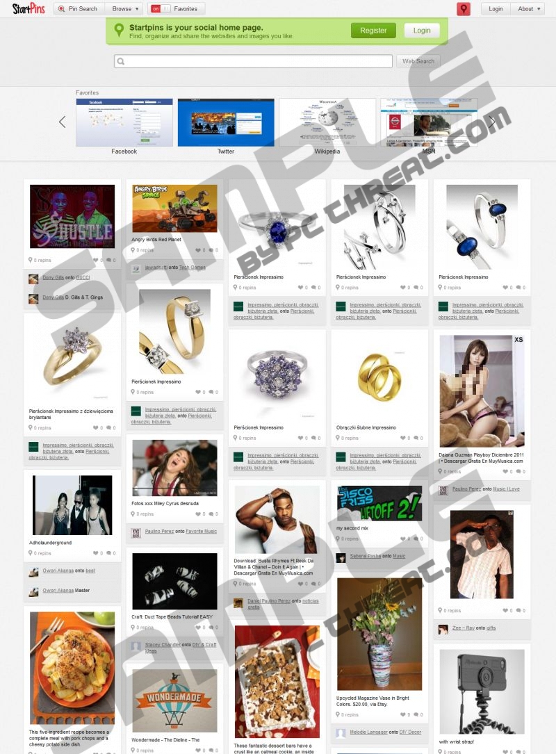 Startpins RedirectIf your web browsing sessions are redirected to starpins.com or affiliate websites, your operating system is most likely infected by the Startpins Redirect virus. The suspicious application is also known as a browser hijacker because of its malignant processes. If you do not remove the vicious infection from your operating Windows system, soon enough it could be used to expose security vulnerabilities and invite more malicious programs. Overall, what you should be most careful about are the unauthorized redirections and browser settings reconfigurations. Have you noticed these symptoms already? Then you should rush to delete Startpins Redirect before the mischievous program causes irreversible damage. Please continue reading to learn more about the threat and its removal. Once you are unexpectedly rerouted to starpins.com, you are asked to log into the site using your Facebook or Twitter accounts. Needless to say, it is not secure to allow the suspicious source to gain any access to your personal accounts, which is why you should ignore the registration recommendations. Are you attracted by the option to “find, organize and share the websites and images you like”? There are alternative options you should employ for these actions because you certainly should not get involved with Startpins Redirect in any way. An excerpt from the Privacy Policy: