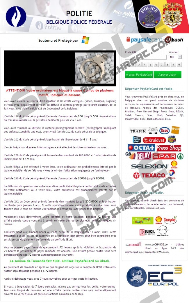 POLITIE Belgique Police Federale VirusPOLITIE Belgique Police Federale Virus is a cunning ransomware infection that is distributed by a Trojan horse known as Urausy. The Trojan has a lot of different interfaces each of which is created with an intention to trick computer users in a particular country. Almost all countries in Europe, including Spain, France, Italy, and other countries, as well as the U.S., Canada, Australia and some North American countries are already familiar with Urausy. If your computer has just been paralyzed by POLITIE Belgique Police Federale Virus, you should disregard its requirements to pay 100 Euros via Ukash or Paysafecard because the only way to remove this annoying warning is by implementing a powerful spyware removal tool. Ignore the heading and the logo of Belgium police and pay no attention to the statements claiming that your computer has been locked because of at least one reason presented. Neither are you charged with the use of copyrighted music, videos or software, nor are you accused of distributing pornographic material. All those articles of law are given to threaten you into believing that the Federal Police (Belgique Police Federale) is working jointly with European Cybercrime Centre (EC3). Consequently, you are supposed to pay a release fee in order to unlock the computer. We ensure you that there is no need to pay criminals because you can remove POLITIE Belgique Police Federale Virus safely without any money loss.