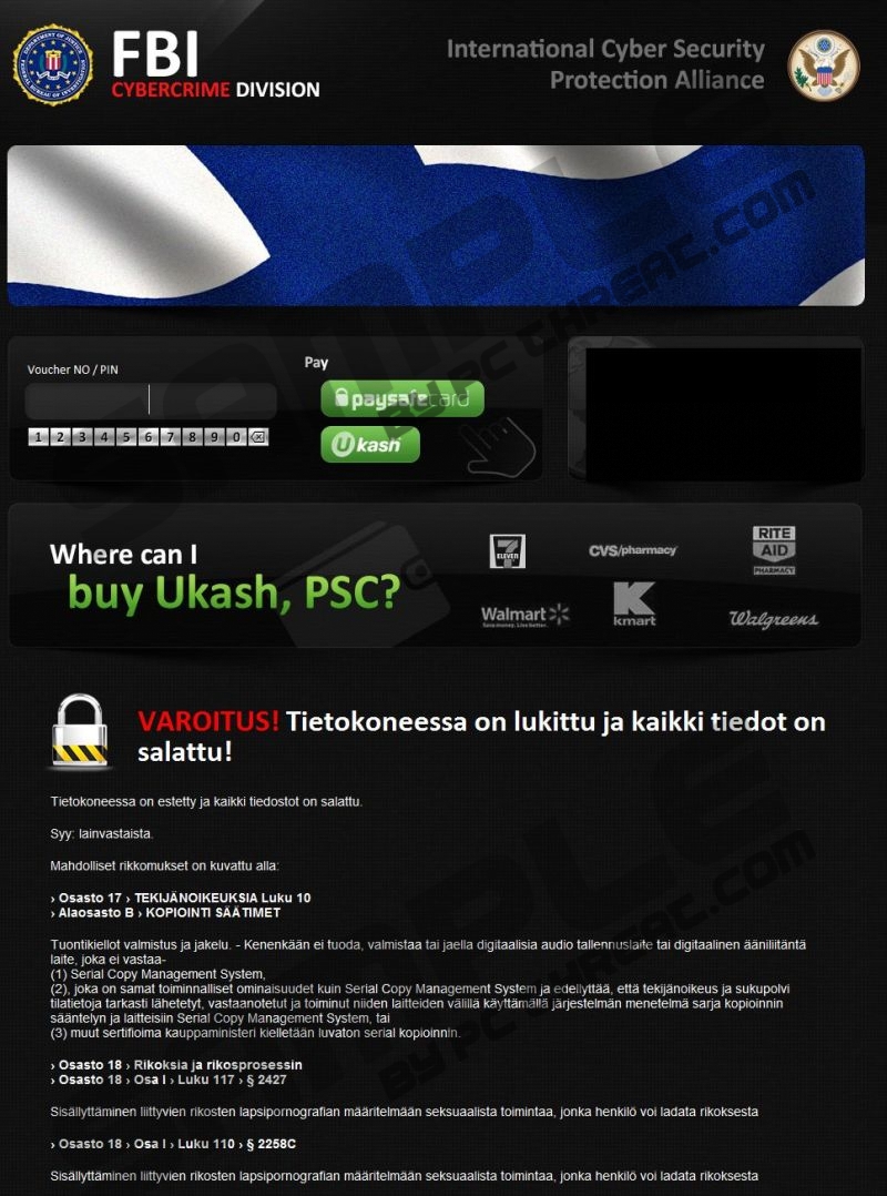 Tietokoneessa on lukittu ja kaikki tiedot on salattuTietokoneessa on lukittu ja kaikki tiedot on salattu virus is a ransomware infection targeted on computer users in Finland. The threat distributing the fake warning that claims that the user has breached some laws locks the computer down which results in his/her inability to access the desktop. Once this threat accesses the system, it is important to delete it from the PC. There are different interfaces of the threat that displays Tietokoneessa on lukittu ja kaikki tiedot on salattu virus. They are written in the official language of the country in which the threat is spread, which means that, for example, in the Norwegian variant, the warning is written in the Norwegian language. However, all of the variants contain the logo of FBI and International Cyber Security Protection Alliance (ICSPA). Both these institutions have been already used by cyber criminals, and this time, you become another victim. Ignore the content of the message of Tietokoneessa on lukittu ja kaikki tiedot on salattu virus as the warning is a scam. According to Tietokoneessa on lukittu ja kaikki tiedot on salattu virus, you have breached some law articles dealing with pornography or copyright; as a result, the computer is locked so that you cannot continue your allegedly illegal actions. However, the warning gives a chance to unlock the computer. You are supposed to pay a fine of 200 Euros, and this has to be done either via Ukash or Paysafecard. In order variants of the virus, you may find another money transaction service MoneyPak. In either case, ignore the fake warning because safe and legal money transactions can be made only on particular websites, which are listed on the official websites of the services. Here is how the fine is introduced: