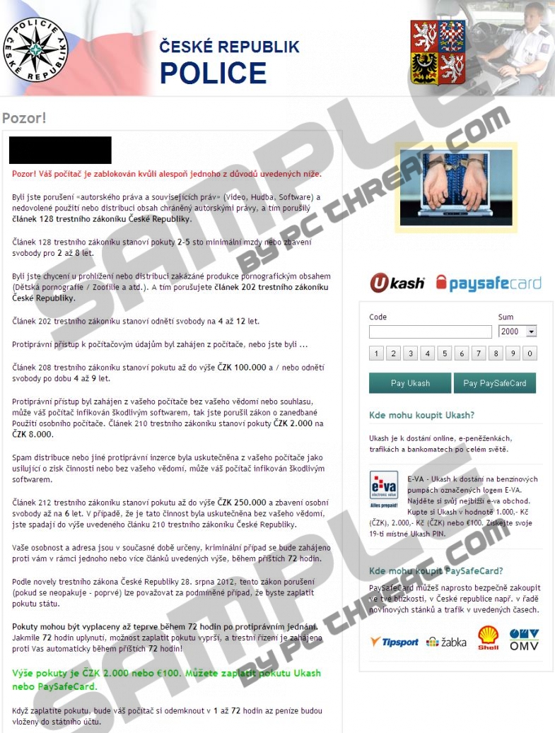 České Republik Police VirusČeské Republik Police Virus is a ransomware threat that has been created to deceive the Czech computer users who do not have reliable spyware removal tools. The threat exploits systems vulnerabilities in order to get to the system, and once it is in the system, it alters the registry and blocks particular executable files, including security programs. Moreover, the threat generates a localized warning that contains the flag and the coat of arms of the country, the headline “České Republik: Police“, and the police‘s emblem. The first thing that you may think once České Republik Police Virus gets to the PC is that the warning is reliable and you should do what you are supposed to. However, the truth is that the warning is a scam as well as FBI PayPal Virus or Politie Office Central Virus which has been spread in Belgium. What you should actually do is remove České Republik Police Virus from the PC as it may function as a backdoor program enabling remote attackers to access the system. Another more important reason why you should not hesitate to remove České Republik Police Virus is that the money that is demanded in the warning will be collected by the criminals. The police would not try to contact the suspects via the Internet, and if you are not sure whether you should trust the bogus warning, you can always consult your local police office. According to the warning, you cannot use the computer until you have paid a fine of €100 or 2,000 korunas. The fine is said to be paid via Ukash or Paysafecard, which means that you are supposed to buy a Ukash or Paysafecard voucher and enter its code in the box given in the warning. The fine is supposedly imposed due to illegal actions performed by the user by utilizing the paralyzed computer. Cyber criminals assume that you will get alerted when you find that you are accused of using copyrighted or pornographic material. Pay no attention to those falsified accusations and remove České Republik Police Virus from the PC right now. We advise using SpyHunter as this spyware removal tool can easily remove various infections which are too complex for regular anti-virus programs. Moreover, it will safeguard the system against various computer threats, so do not wait and act now. České Republik Police Virus RemovalWindows Vista and Windows 7