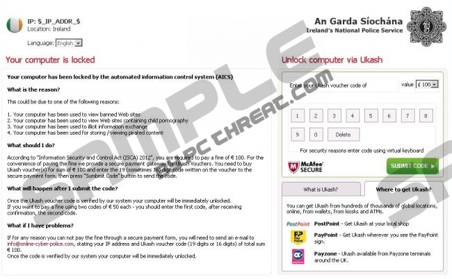 GARDA VirusWhen you get infected with GARDA Virus you see a notification on your screen that says “Your computer has been blocked up for safety reasons listed below”. Unfortunately, GARDA Virus has nothing to do with computer safety, as it is a computer infected created by cyber criminals. They deny you desktop access in hopes of making you believe that you have committed a serious crime and now you need to pay (financially). However, do not succumb to these threats and remove GARDA Virus from your system as soon as you can. And while you are at it – remove all the other infections that are bound to be there. GARDA Virus is part of the Ukash Virus group, just like FBI MoneyPak Virus and the most recent infections Australian Communications and Media Authority virus or Metropolitan British Police Virus. These computer threats are being distributed by Urausy Trojan, which means that you need to be extremely attentive when you browse the Internet or download various freeware applications. Avoid clicking on outgoing links to unreliable websites, and do not visit web pages that are full of adware and pop-up commercial ads – clicking on such an ad may result in getting infected with GARDA Virus at once. This infection is intended for the computer users in Ireland. It is rather obvious, because it has Irish flag on its interface, as well the symbols and insignia of the Irish law enforcement authorities (The Guardians of the Peace of Ireland, The National Crime Prevention Unit). However, just because it is full of law enforcement authorities symbols it does not mean you need to trust it. The message displayed by GARDA Virus may seem threatening, but you need to realize that you have done nothing wrong, and the message is only a hoax designed to swindle you out of your money: