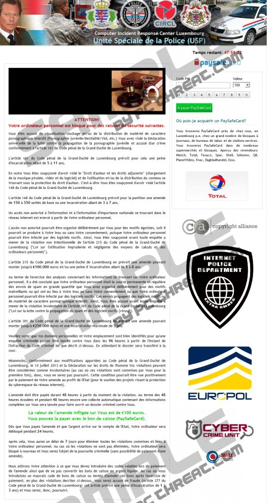 Computer Incident Response Center Luxembourg virusIf your operating Windows system has been corrupted by the malicious Computer Incident Response Center Luxembourg Virus, you need to figure out the best way to remove this infection as soon as possible. If you do not get rid of the clandestine threat, soon enough schemers could employ Windows security vulnerabilities to infect your personal computer with even more computer infections. Without a doubt, you already have your hands full with the clandestine ransomware and the Trojan which has activated it for the time being. Note that there are tens of devious Trojans which could slither into your PC using drive-by download scams and which could block access to the desktop soon enough. Some of the most notable threats include Flimrans, Gimemo, LockScreen.CL, Urausy and Reveton. You need to delete these threats in order to remove Computer Incident Response Center Luxembourg Virus notification from the desktop. Just like the previously reported threats FBI Federal Bureau of Investigation Virus and Centre for Critical Infrastructure Protection (CCIP) Virus, the clandestine ransomware uses misleading information to trick you into thinking that you need to pay a bogus fine. Do not be alarmed by the credentials of such reputable departments as USP, Copyright Alliance, Internet Police Department, Europol, Interpol or Cyber Crime Unit. These credentials have been attached illegally just so that you would believe this fictitious information:
