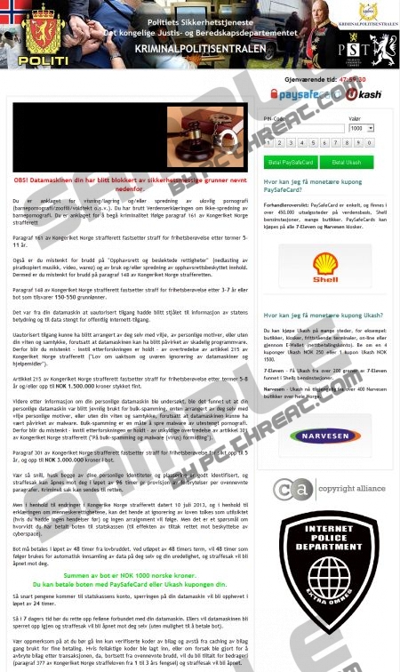 Politiets Sikkerhetstjeneste virusPolitiets Sikkerhetstjeneste Virus is yet another version of the clandestine Urausy Trojan ransomware which could take over your own Windows system if you currently reside in Norway. The malicious infection can reconfigure the Windows Registry and remove access to the entire computer, which is why you have to ensure that your operating system is protected at all times. If the threat has already paralyzed the system, you are now forced to pay attention to completely bogus information regarding cyber crimes which allegedly have been performed from your PC. Are you related to cyber crime? If you are – stop all of the illegal activity right away, or Police will come knocking at your door soon enough. If you have nothing to do with the listed accusations, like the distribution of pirated music files, ignore the presented information and delete Politiets Sikkerhetstjeneste Virus as soon as possible. Do you know which removal strategies to employ? Whilst some Windows users recognize a scam just by looking at the illegally attached credentials of Internet Police Department, Interpol or the Norwegian Politi, others could be confused. Without a doubt, the names and logos attached to the screen-locking notification create an illusion that the lock-down of the computer has been initiated legally. Remember that all of this is just a scam, and you should pay no attention to the fictitious accusations. Note that the bogus demands and intimidating statements could be presented to you if the PC is infected with Datamaskinen Din Har Blitt Låst Virus, Politiet Norge Ukash Virus and other malign, surreptitious ransomware infections.