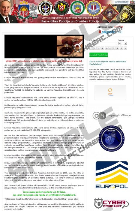 Just like Latvijas Valsts Policija Virus, the malicious Latvijas Republikas Satversmes Aizsardzības Birojs Virus can corrupt the PC, remove access to the desktop and provide misleading information. Even though the accusations and statements listed within the warning seem authentic, in reality they are generic. Our researchers have discovered that KRIMINALPOLITISENTRALEN Virus, Poliisihallituksen Virus, Ministry of Public Safety Canada Virus and other recently discovered ransomware infections use the same text! Of course, the interfaces of these infections are different, including the credentials attached alongside. As a statement at the bottom discloses, your PC has been locked by authentic law enforcers: