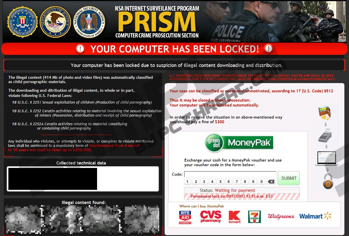NSA VirusNSA Virus is a dangerous ransomware infection which installs itself without the user’s permission. The infection creates new registry entries in the Registry, drops its files in various locations, and modifies the running process so that you cannot access the desktop and use the PC as usual. The only mission of NSA Virus is to lure the computer user into paying the so-called fine of $300. Once you find that your computer is afflicted by NSA Virus, which is also labeled as PRISM Virus, ignore the information provided its warning and take immediate measures to remove it from the PC. According to the bogus warning, you are contacted by the National Security Agency (NSA) which implements the PRISM program. Moreover, the warning contains the logo of the Federal Bureau of Investigation (FBI) and the Department of Justice. The emblems are supposed to convince the user that the warning is legitimate. Furthermore, the ransom warning contains false accusations. The computer is said to be locked because you are said to be suspected of downloading, using, and distributing illegal content, such as child pornography. It is highlighted in red that the individuals who are related to this type of crime may be imprisoned and obliged to pay a fine up to $250.000. You will find that the warning indicates the status of the payment, which reads “Waiting for payment”. There is no need to pay $300 for the money will be received by the criminals hiding behind NSA Virus. MoneyPak, which is presented as the method of paying, can be used on the partner’s websites or in some other ways indicated on the official website of the service. In the present situation, your computer is affected by a dangerous Trojan horse, which you should remove right now. The removal will be an easy procedure if you use a powerful spyware removal tool. We recommend that you install SpyHunter as this application has already removed different ransomware infections, including Ministerul Afacerilor Interne virus, Služba Kriminální Policie a Vyšetřování virus, and many others. The instructions below will help you install the application in the right way so that you can discover how this time-saving program works. NSA Virus RemovalWindows Vista and Windows 7