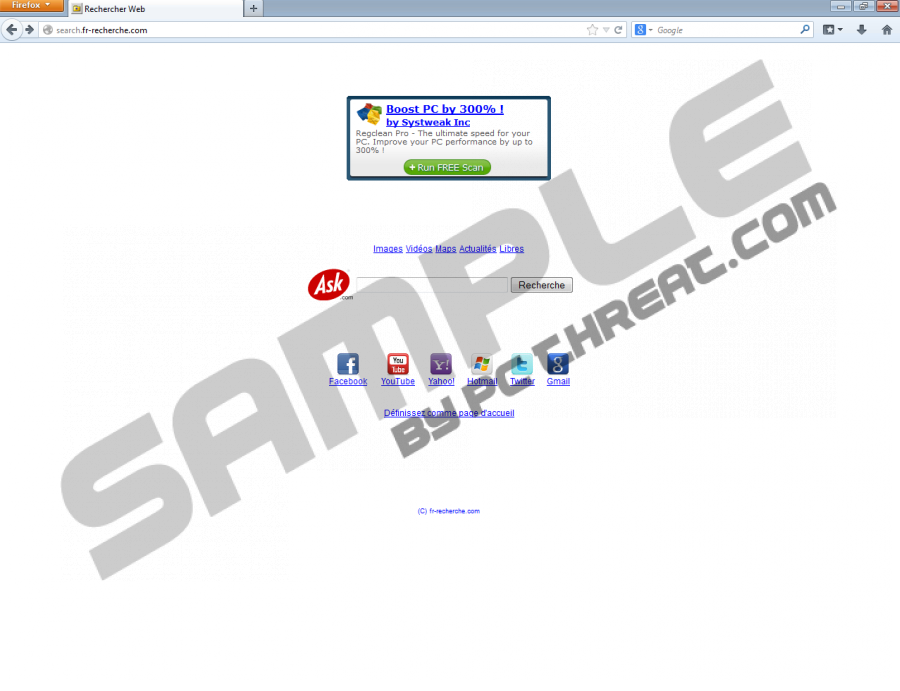 Search.fr-recherche.comIf you ever notice that your homepage and search engine have been changed to Search.fr-recherche.com, you should know that a browser hijacker has affected your system. It will probably enter your system without your permission; however, you will definitely observe the changes that it is going to perform. Even though all the text placed on this search engine is in French, it does not mean that it cannot affect computers in other places. As it is compatible with Internet Explorer, Google Chrome, and Mozilla Firefox, you should be extremely careful because it means that it might infect your system as well. Have you already notice Search.fr-recherche.com set as your homepage? You should definitely get rid of this browser hijacker without any delay. One of the main reasons why you should not keep it on your system is the fact that it provides sponsored links together with search results. It does not matter that it uses Ask search, which is not a bad search engine itself, you should still be careful because not all these sponsored links might be trusted. It means that you might infect your computer with malicious software that might be hiding on unreliable websites. What is more, you will see different kinds of advertisements on your homepage. They will not only bother you, but also might cause security-related problems. This is one of the main reasons why we recommend erasing Search.fr-recherche.com browser hijacker from your system. It has been found out that there are some other suspicious features of Search.fr-recherche.com. For instance, the specialists have revealed that this browser hijacker is capable of collecting different information associated with your browsing habits. Such data includes the websites that you visit, the time you spend on them, and other relevant information, including your IP address, the version of your OS, and similar. It is not so-called sensitive data; however, you should still be cautious. The removal of the browser hijacker is the only effective solution. There are two possible ways to get rid of Search.fr-recherche.com: you can do that manually or automatically. As manual removal might be difficult for those computer users that do not have much experience in malware removal, we recommend using an automatic remover, for instance, SpyHunter. It is definitely worth investing in it because it will not only detect and remove the threats existing on your PC, but also protect your computer from future infections. How to erase Search.fr-recherche.comInternet Explorer
