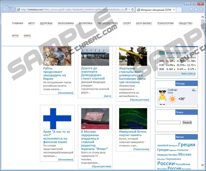 Inetoboz.comYou probably were not expecting to see the likes of Inetoboz.com in your web browser when you have recently downloaded some freeware from a file-sharing website. Unfortunately, that is the gruesome reality of the contemporary Internet. Browser hijackers like Inetoboz.com manage to slither into target systems when users expect that the least. They change your default browser settings and then track your online activities in order to make money for their creators. If you do not remove Inetoboz.com from your system, we believe that you will be soon infected with countless malicious threats that will eventually lead to the ultimate system crash. At first glance, Inetoboz.com may look like a Russian news website, but in reality it is nothing but an annoying infection that hijacks all your shortcuts and then exposes you to unreliable content. Our research shows that the hijacker’s installer looks like an image file, and it usually has a picture of a naked female. This would suggest that users often get infected with Inetoboz.com when they visit adult and pornography websites. However, that might not be the only places that promote this hijacker. Any adware-related website that contains a lot of pop-ups and other types of advertisements could be easily used to distribute Inetoboz.com. Inetoboz.com affects all the main browsers, so it does not matter which browser is your default one. Once you get infected with this hijacker, the next time you launch your browser, you will be automatically redirected to Inetoboz.com. The website provides you news and search feature in the Russian language. For example, you can choose between cars, health, economy, politics, sports, show business, technology, and other sections. However, it is highly questionable whether the information provided by Inetoboz.com is reliable. After all, the main thing this hijacker is after is money. Although Inetoboz.com does not steal your money directly, it does not really about transparency and things like that. For example, Inetoboz.com might contain links to unfamiliar third-party sites. Hijackers often employ the pay-per-click system to generation financial profit. This means that when you click some link via Inetoboz.com, you increase the website’s traffic, and consequently, the people behind Inetoboz.com get money for that. Needless to say, there is nothing in it for you. Not to mention that some of the links promoted by Inetoboz.com could lead to corrupted websites that distribute malware. The point is that you must remove Inetoboz.com from your computer; otherwise you would be facing even more dangerous infections. We provide manual removal instructions below this article, but would also like to point out that Inetoboz.com is probably not the only uninvited guest in your computer. You should scan your PC with the SpyHunter free scanner to get a full list of unreliable applications currently running on your system. If possible, remove the unwanted programs via Control Panel. Finally, invest in a legitimate antispyware application to terminate any leftover junk that is too challenging to remove manually. You have to do all you can to protect your PC from various infections. It is not just about your system anymore. It is about your personal information, your money, and your safety. How to Remove Inetoboz.com