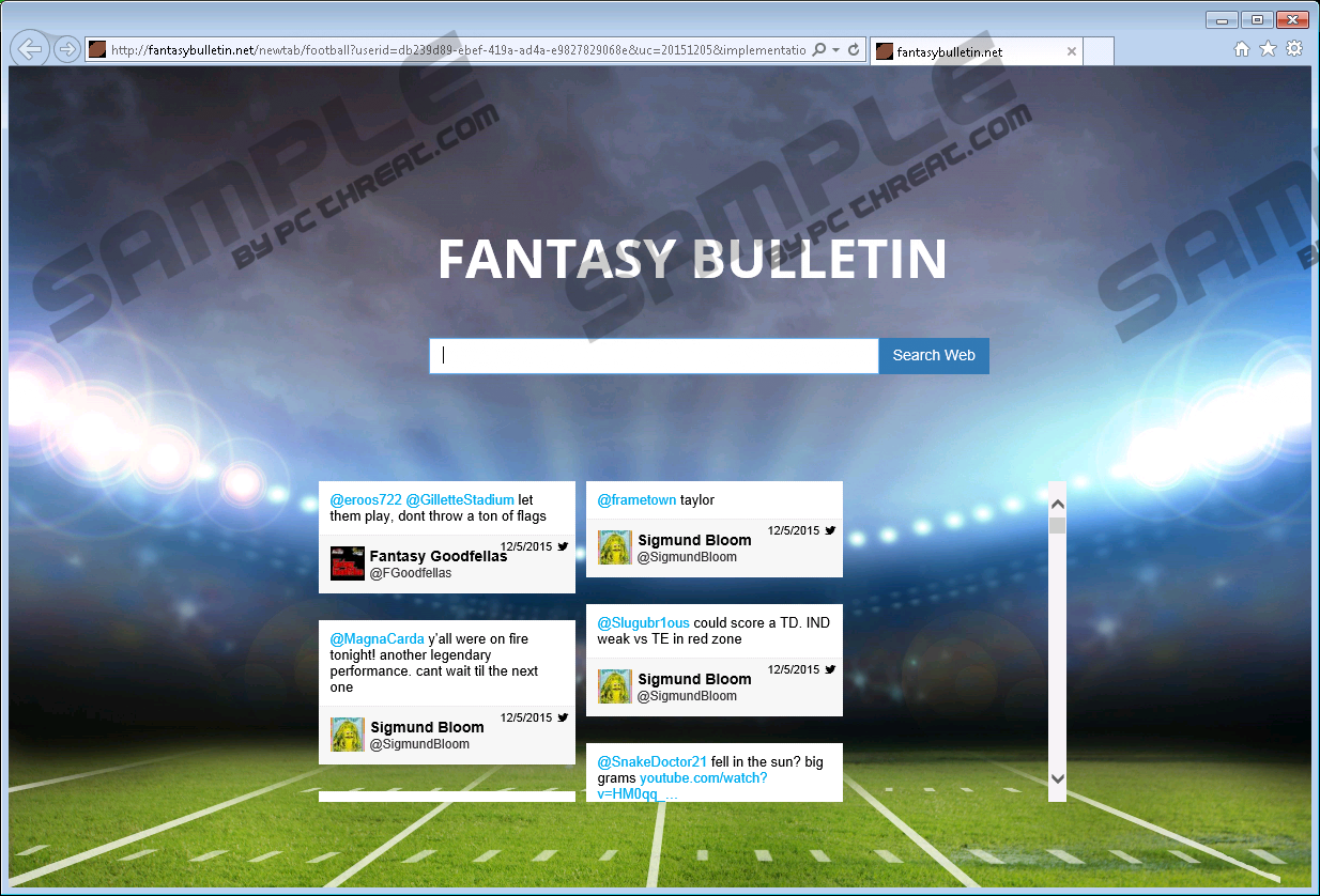 Fantasybulletin.netFantasybulletin.net claims to provide you with “the most up-to-date sports data online,” but we have found that this search engine may be set as your home page, default search engine, and new tab page in your browsers by a browser hijacker. This could be the reason, too, if you do not recall allowing these changes. However, in all fairness, we must mention that many users overlook the options usually offered when they are installing free tools or freeware bundles. The presence of this browser hijacker may cause system security issues for your computer by exposing you to potentially unsafe third-party content. We believe that you should remove Fantasybulletin.net before the fantasy of being scammed by cyber criminals becomes sad reality. You can install this browser extension right from the website Fantasybulletin.net. However, if you are a sports fan and would rush to click on the “Add extension” button, we recommend that you read carefully what you agree to. This extension can “read and change all data on the websites you visit.” This may not scare away most users, but by allowing this to take place, you may give permission to this hijacker to spy on you and collect information about you. As a matter of fact, this browser hijacker can collect all kinds of information about your online activities, which can be used to set up a profile on you. This profile can be shared with or sold to third parties, who will be able to display targeted advertisements on your computer screen based on this profile. The danger in customized advertisements is that you may be more willing or inclined to click on them than on non-relevant junk ads. But just because you see a best-deal pop-up ad of a product you really want to get, it does not mean you will get it if you click on it. What if cyber criminals are posing as an online shop with, of course, a fake website? You might be tricked into revealing your banking details to them. Also, this hijacker displays several Twitter feeds below the search box based on your preference of sports. But what if it also injects third-party ads or links into the linked pages? It is also possible that it can modify the search results, and you may end up on a manipulated Yahoo search results page, as this hijacker uses a redirection instead of having its own engine. Since this unreliable search engine can show up every time you launch your browsers, you will be introduced to potentially unsafe content constantly, unless you make up your mind and delete Fantasybulletin.net. Although currently we cannot confirm that this browser hijacker travels in freeware bundles, since it is still quite a new infection we can infer that sooner or later you will find it in bundles packed with malicious installers, because that is how practically all hijackers are distributed over the net. That is why you need to be extra careful how or where you download applications. Choosing the wrong website could result in downloading a bundle full of malware infections. Removing Fantasybulletin.net would not save your computer from the other threats; if you are in doubt, always run a malware scanner on your computer. It can be a free online scanner, but make sure it is a reliable one. You can also check manually whether certain infections are on board. First, you should open your Control Panel and check the list of installed programs. If you find any application that is suspicious, you should run a Google search on it to make sure you can remove it. Then, you can inspect your browser settings to see if you find any unwanted extensions. As a matter of fact, if you want to eliminate Fantasybulletin.net, you also need to start with uninstalling the application first via Control Panel. But this uninstaller leaves leftovers. If you do not clean them from your computer, this hijacker will remain a threat source. That is why you need to manually remove the extensions from Google Chrome and Mozilla Firefox. If you need help with these steps, please use our instructions below. Also, remember that you should periodically update all your programs, including your Windows operating system and browsers. You need to do this because cyber criminals can exploit certain security holes in these and gain access to your files and precious information. If you want to feel totally safe, we advise you to implement a reliable antimalware program. How to remove Fantasybulletin.net from WindowsWindows XP