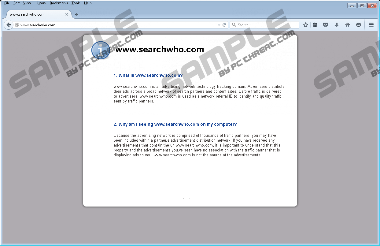 Searchwho.comSearchwho.com is a currently non-functioning search engine that we have classified as a browser hijacker due to the deceptive methods it is distributed. If you want to remove this hijacker from your computer, then we suggest that you read this short description as it contains a lot of useful information. Now, in short, this browser hijacker’s main goal is to generate advertising revenue. So if it happens to work in the near future, then it is bound to display a lot of promotional ads in its search results. The problem is that it is likely that at least some of those ads can promote malicious content, such as malicious software that can jeopardize your computer’s and even your personal security. Therefore, it is vital to delete this injection as soon as possible. More often, than not, we do not get to know the names of the companies that developed a certain infection. And, this seems to be the case with Searchwho.com. There is virtually no information about this infection’s origins. Nevertheless, we have found that its Internet Protocol (IP) address is located in Los Angeles, California, USA. Therefore, it is also reasonable to assert that it is marketed for the US and perhaps the Canadian market. Unfortunately, this hijacker’s dissemination methods are as deceptive as they can get. We have found that Searchwho.com it may still be bundled with malicious software that is put up for download on shady software distributing websites. It is safe to say that this hijacker is most likely being bundled with adware-type programs and potentially unwanted programs (PUPs.) However, this infection is not known to have its accompanying application or browser extension. Thus, is becomes clear that the bundled installers it comes with have been programmed to inject Searchwho.com into the browser. So you do not get to choose whether you want it to become your browser’s homepage or not. As mentioned, Searchwho.com’s main goal is to generate advertising revenue. And, it is not accidental that it is also a search engine because being a search engine, this hijacker can get away with displaying promotional links that seamlessly blend in with the rest of the content in the search results. Searchwho.com may be usable as a search engine, but most likely redirect all of the search queries to another search engine, but not before connecting to a server that gives this hijacker information on what ads to display. It is also quite likely that it is set to collect non-personal information, such as your geographical location, browsing, and search queries, and so on to customize the ads. It is also worth mentioning that Searchwho.com has a lot of clone names, such as jokes.searchwho.com, politics.searchwho.com, srvabc.com to name a few. In all, this browser hijacker has 27 different names. You might even call them clone websites. However, they share one commonality — all of them currently do not work. This is, without a doubt, a good thing. However, the malicious software bundles it comes part of still inject it into the browsers (this browser hijacker can affect Internet Explorer, Firefox, and Chrome.) And, there is no telling when it will start working again and presenting links to malicious websites that can turn out to be download links to malicious software, such as spyware, ransomware, and other Trojans. Therefore, we urge you not to waste any more time any seize the opportunity to remove Searchwho.com from your computer. This hijacker is known to modify DNS settings, but in most cases changing the homepage should be sufficient. Nevertheless, we recommend resetting your browsers’ settings to default just to be sure. So please consult the removal instructions below for more information. Reset your browsers’ setting to defaultGoogle Chrome