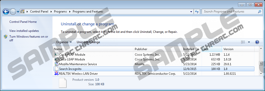 Searchincognito.comThe first indication that a browser hijacker is up and fully running on your operating system is a sudden change of your web browser's default settings. A hijacker that is known to be active nowadays is called Searchincognito.com. If it is ever found operating on your personal computer, you must execute its complete removal without any hesitation. We firmly advise you to do so due to its intrusive functionality that will extremely limit your ability to surf the web. On top of making unauthorized changes, this program might act in a potentially malicious way since it could turn out to be the reason your personal computer could get exposed to suspicious and intrusive web content. Thus, having this hijacker active on your PC is not only annoying but could actually have detrimental outcomes. Do not hesitate to use the removal guide that we present below to get rid of Searchincognito.com once and for all. Read the rest of this report to understand how this invasive piece of software functions and why its complete removal is recommended. At the very same time that Searchincognito.com enters your operating system, it will modify the default settings of major web browsers such as Mozilla Firefox, Google Chrome, and Internet Explorer. In no way will you be notified about all these changes, which is frustrating, to say the least. The browser hijacker in question will alter your default search engine and home page. Since it is fully compatible with the mentioned popular browsers, it means that nearly every user is at risk of getting their PC infected with this undesirable application if they do not take virtual security seriously. It is important to highlight the fact that even though you might think that the changes made by it are irrelevant, for as long as it will be active on your computer the whole online experience will be changed entirely. Starting your online session on a web page that you usually do will be almost impossible as you will be forced to use a questionable third-party site as your default home page. Instead of searching the web via your preferred engine you will have little to no choice but to use the new one that Searchincognito.com provides you with. It is important to take appropriate measures to remove this intrusive browser hijacker once and for all as it is the only way that you will be able to revert the changes made by it to your web browser. While all the annoyance caused by Searchincognito.com is its most prominent feature, you must know that it certainly is not the worst one. There is something much more alarming, even dangerous, about this hijacker than you might think. After conducting an in-depth analysis of it, we have found out that the newly appointed search engine, in particular, is the most suspicious part of it. This is so because as it turns out, it could present you with devious search results; the majority of them will be worthless sponsored ones, but in some rarer cases you might come across a result that hosts a redirect link within it. To put it in simple terms it means that by clicking on such a result you will most likely be taken to some suspicious third-party websites and in some cases those websites might turn out to be malicious. For instance, you could be taken to sites hosting malware or sites crafted to steal your sensitive financial data. Landing on any of them could obviously have disastrous outcomes. Even though such results will not occur on a daily basis, it is still a possibility to come across one, and just one click could be more than enough to cause harm to your operating system or sensitive data. Do not take the risk of running Searchincognito.com on your personal computer and conduct its complete removal as soon as possible. The removal procedure is a two-step procedure as you will need to delete Searchincognito.com via Control Panel and them remove it from your web browser. Once you are done whit the manual removal, you should check your operating for potential leftovers linked to Searchincognito.com as just a few traces of it could still be enough for it to continue its devious functionality. If you think that such analysis of your computer might be too complicated, make sure to run a full system scan by using a reliable antimalware tool as it will detect any dubious leftovers and will get rid of them in an automatic way. How to remove Searchincognito.com from your PCWindows 10
