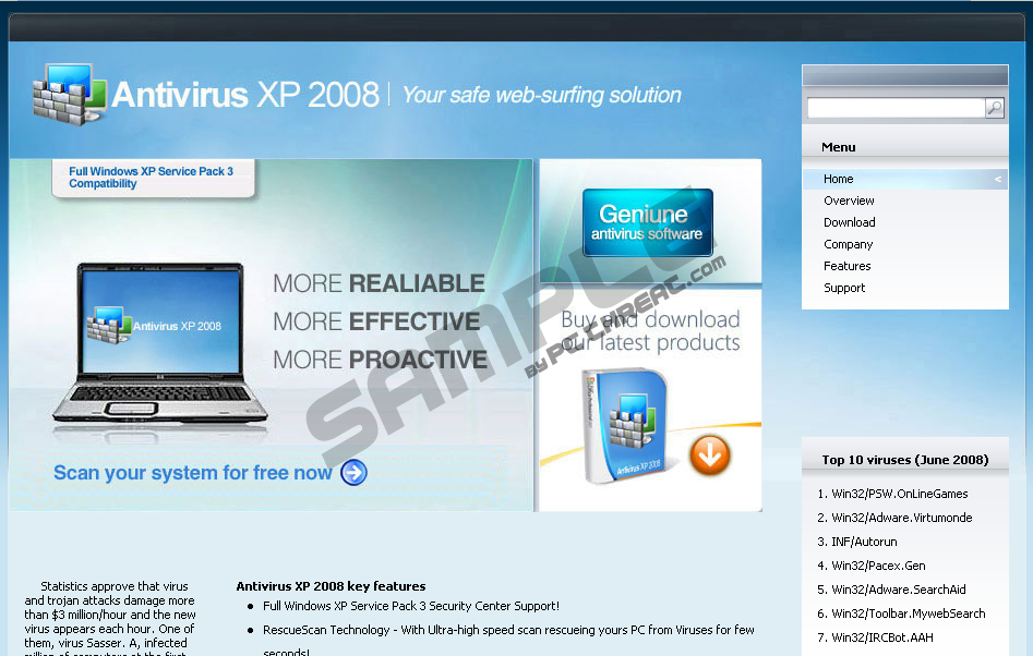 AntivirOnLine.COMAntivirOnLine.COM is a latest Browser Hijacker. AntivirOnLine.COM promotes rogue antispyware program AntivirusXP2008 (or Antivirus XP 2008, AntiVirXP08, AntivirusXP 2008, Antivirus2008XP). AntivirOnLine.COM is extremely dangerous and it should not be trusted!!! AntivirOnLine.COM was designed to look like normal antispyware site... BUT it is NOT!! This site only wants to trick and scare users into buying a rogue antispyware program that it promotes in this case AntivirusXP2008 (or Antivirus XP 2008, AntiVirXP08, AntivirusXP 2008, Antivirus2008XP). If users downloads a "free" trial of AntivirusXP2008 it starts to shows that their computer system is infected. But AntivirusXP2008 uses fake security alerts, fake scan reports to trick user into buying "full" version of AntivirusXP2008 program. The only spyware that users have in their system is AntivirusXP2008. This is all that users need to remove from their computer system to fix all of their problems. Do not trust AntivirOnLine.COM and all programs that it sells! |
