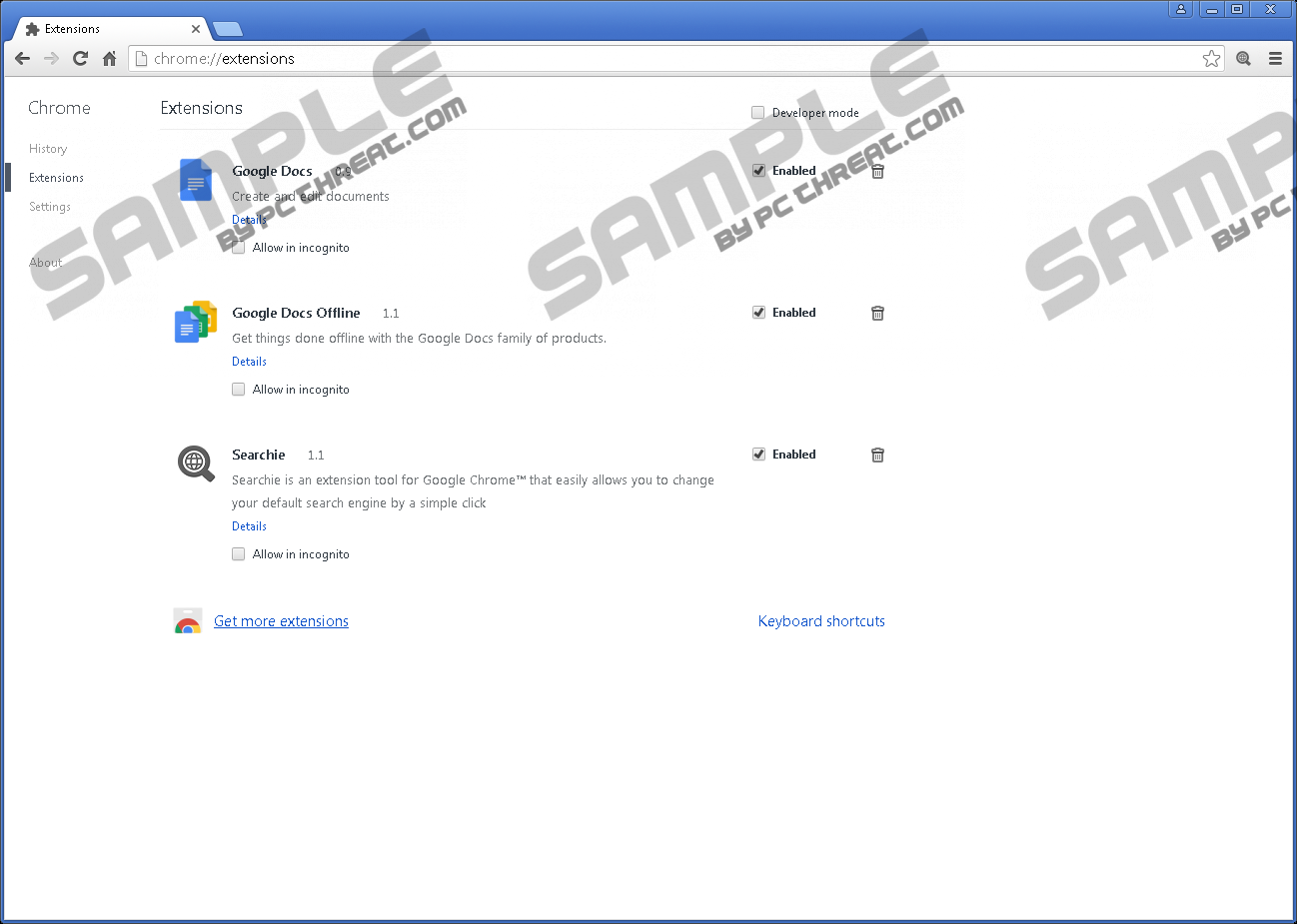 SearchieWhen you deal with such programs as Searchie, you do not need to panic or worry because they can be removed from your computer without much difficulty. In fact, some users choose to keep this extension because it looks absolutely harmless. However, computer security experts point out how important it is to avoid unwanted programs that seem to enter your system without your permission. This is the problem with the extension as well. For the most part, it happens to be installed on target browsers accidentally, and whenever that happens, you have to be aware of potential security issues you may encounter because of that. Luckily, this browser extension works only on the Google Chrome browser, so you do not need to worry about it if you use other popular browsers. Nevertheless, considering that the program often travels in software packages, it would be a good idea to check your other browsers for similar plug-ins as well. What is a software package? That would be a bundle of applications delivered by one installer. Third-party installers often come with such bundles, especially if you download them from file-sharing websites. It should not take long to dawn upon you that downloading programs from third-party sources is not as safe as you would wish it to be. It is quite often that unreliable developers host their software on such sites, and the installers you download may have a lot more programs than you want. Therefore, to avoid the likes of Searchie, you should be careful when you install freeware applications. Normally, the installation wizard should list all the additional programs you are about to install on your PC, and it should be possible to deselect them. However, quite often users lose this opportunity because they are too gullible and too negligent to read through all the setup steps. As a result, they end up with a lot of unnecessary and potentially harmful tools. It would be hard to call Searchie a dangerous program because the extension is also available on the Chrome Web Store. In fact, when you open the program’s site at searchie.net, clicking the download button eventually redirects you to the Chrome Web Store, where they offer you to add the extension to your browser. Now, it is clear that you can install the plug-in without anyone coercing you to do so, but at the same time, the question is whether you really need a tool with such functions. When you add this extension to your browser, it allows you to choose between several search engines. You can set google.com, youtube.com, amazon.com, bing.com, search.yahoo.com, and search.strtpoint.com as your default search engine. What’s more, the extension also changes your new tab settings, by setting search.strpoint.com as your default new tab page. You will also see that h.searchie.net becomes your homepage, so if you were not aware of the oncoming modifications, you may think that your computer has been trespassed by a browser hijacker. Nevertheless, it is this extension that you have to deal with, and, thankfully, it is not too complicated. You can remove Searchie by editing the extension settings via your browser’s menu. This application does not have an entry in the list of installed programs, so you cannot delete it via Control Panel. However, as mentioned, you should consider scanning your system with the SpyHunter free scanner because you could have been swarmed by many other unwanted apps. Has your computer been processing things slower than the usual? Do you experience a lot of pop-ups when you browse the Internet? If so, then Searchie may not be your only problem at hand. It would not be surprising if you had multiple applications and programs working behind your back, trying to redirect you to unfamiliar websites for monetary purposes. Please do all you can to protect your computer from malicious infiltration by terminating all the potentially harmful applications today. Your computer’s security is in your hands. If you think that you are not experienced enough to create reliable safeguard, we are always ready to assist you. Please leave us a comment or contact us via social media, and we will tell you how to deal with Searchie and tons of other programs that might be threatening your PC’s stability. How to Remove Searchie