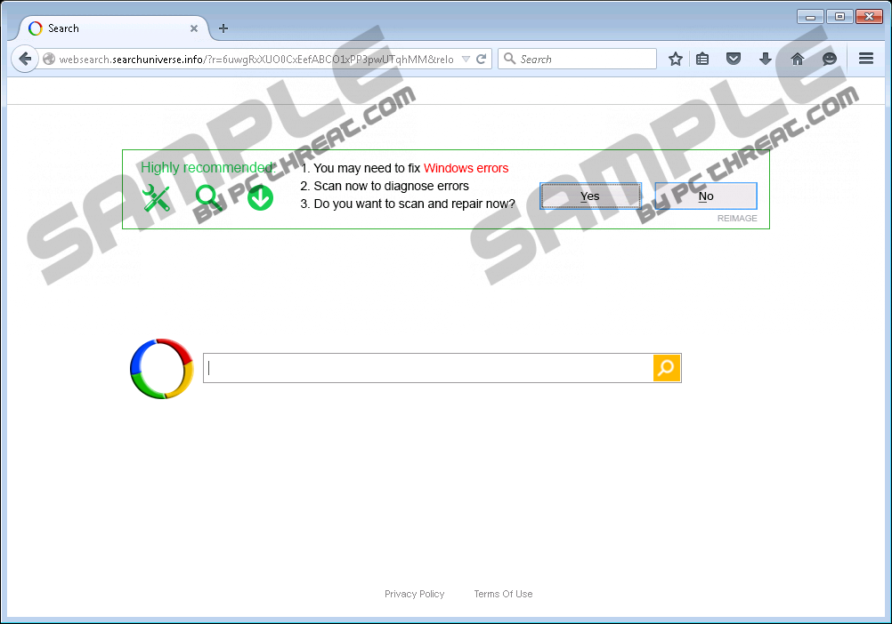 Websearch.searchuniverse.infoBrowser hijackers are increasing in numbers every day as most of them are clones of each other. Websearch.searchuniverse.info is a hijacker that belongs to the Websearch family. You should want to remove it because it is distributed using a clandestine and dishonest manner, so if you have it on your PC, then you most likely got it unintentionally. In this article, we are going to cover this infection’s dissemination methods, and functions and purposes. Lastly, we are going to provide you with the means to delete it from your web browser, so please continue reading. Browser hijackers are considered as computer infections because they are distributed in such a manner that requires them to be injected to a computer without the user knowing about it. We have tested this infection and found that it can affect Microsoft Internet Explorer, Google Chrome, and Mozilla Firefox. It is set to replace the homepage of Internet Explorer and Firefox and the new tab page of Google Chrome. However, it does not change the search provider of either of these web browsers. The reason for performing this malicious activity is to redirect web traffic to Websearch.searchuniverse.info. Testing has shown that when you enter a search term to Websearch.searchuniverse.info, then it will redirect you to Worldsearchpro.com a shady search engine that features three search results that are claimed to have come from Yahoo.com. Clicking on anyone one of those search results will redirect you to Search.us.com. This search engine is the final stop, and it is this search engine that gives you the final search results. We have found that Search.us.com often contains links that promote certain third-party websites. Some of them redirect to other search engines, such as Us.when.com, while others redirect to sites. We want to stress that you cannot be certain whether the promoted websites are legitimate since Websearch.searchuniverse.info and the search engines it redirects to are not legitimate whatsoever. Furthermore, this browser hijacker is currently configured to advertise a shady program on its main page. The name of this program is Reimage. This program is very familiar to us since it has been around for some time now. We are aware of it precisely because it is shady and has been classified as a potentially unwanted program that is paid, but does not perform useful functions. We are not surprised in the least because this browser hijacker comes from a well-known group of browser hijackers that we refer to as the Websearch browser hijacker family. Indeed, you can recognize a hijacker from the family be looking at the URL. For example, some of Websearch.searchuniverse.info’s clones are called Websearch.searchdwebs.info, Websearch.searchdominion.info, and Websearch.searchplazanow.info. They all come from the same group of developers. However, we do not know the name of the company because their browser hijackers were not signed by anyone. This is indicative of the fact that Websearch’s browser hijackers are malicious because a legitimate company would not hide in the shadows. As far as Websearch.searchuniverse.info’s dissemination methods go, we want to inform you that it is being distributed in a very dishonest manner. Our research has revealed that it comes bundled with InstallRex installers that also bundle potentially unwanted programs such as LightningDownloader and Optimizer Pro. So in addition to having your web browser infected with a browser hijacker, you might also shady apps installed on your PC. We have found that such bundles are advertised on various torrent websites that you can install by clicking a fake download torrent button. Nevertheless, we believe that these malicious software bundles are not limited to torrent sites and can be found elsewhere. However, currently, we have no additional information about other websites they might be featured on. We hope that you found the information we have provided enlightening. As you can see, Websearch.searchuniverse.info only poses as a legitimate search engine while in reality it is used to generate advertising revenue for its developers and their clients. As a search engine, this hijacker is very annoying as it redirects you to other shady search engines which make performing Internet searches a real pain. So we invite you to remove Websearch.searchuniverse.info and uninstall any additional software that it may have come with. How to remove this browser hijacker from your web browserMozilla Firefox
