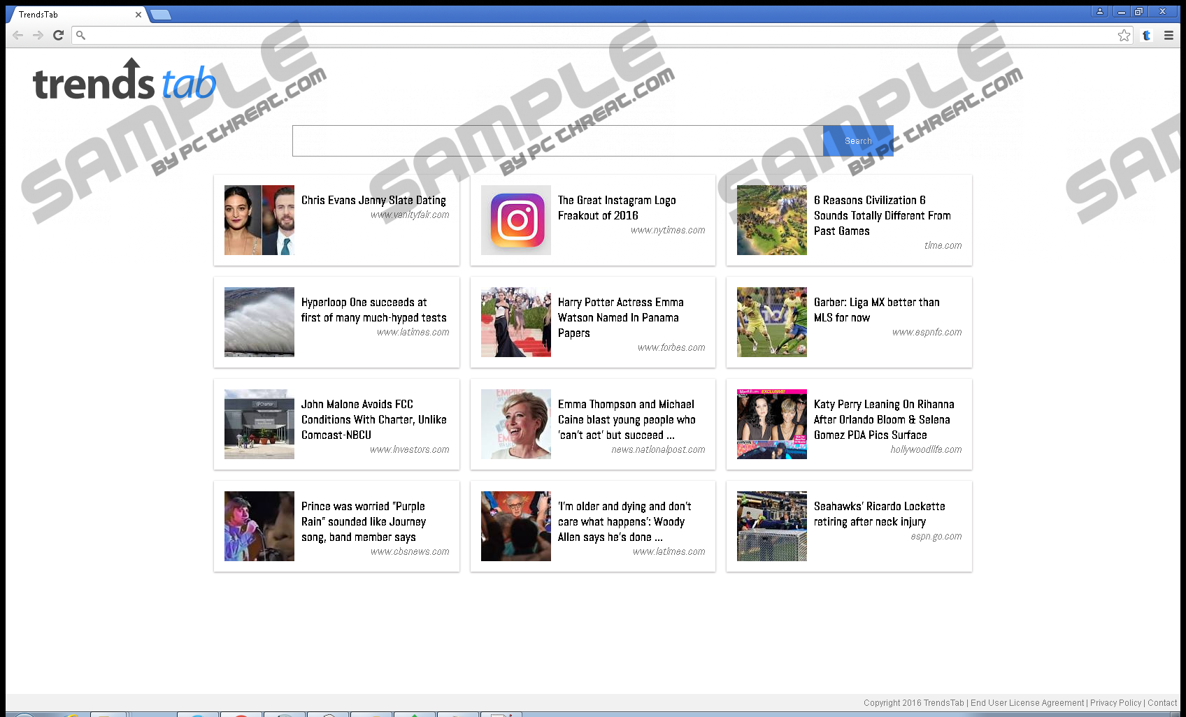 TrendsTab.comTrendsTab.com (search.trendstab.com) is a search engine that sets itself on the Google Chrome browser after users install the extension called TrendsTab. This piece of software belongs to the infamous SuperWeb family of software, and it can be easily downloaded from trendstab.com or the Chrome Web Store (chrome.google.com/webstore/detail/trendstab/fnjbpdhhdalaalamiieicdjiflbikbdk). Even though this software can be downloaded from such a source, it does not mean that it can be fully trusted. Actually, the majority of users install the TrendsTab extension only to be able to “find out what’s trending today;” however, they also notice that the settings of their New Tab pages have been changed, i.e. TrendsTab.com has been set. Unfortunately, we cannot guarantee that TrendsTab.com is a trustworthy page. Besides, we have managed to find out a suspicious fact about it. Therefore, in our opinion, it would be best to get rid of it. If you have already installed the TrendsTab extension, you will see the TrendsTab.com page every time you open your New Tab page. This page looks quite trustworthy at first glance; however, we definitely cannot call it fully reliable, so it would be best to get rid of it. First of all, it has been observed that TrendsTab.com will redirect all the searchers to Search.us.com. In other words, you will be taken to this website after entering a keyword into the search box of TrendsTab.com. Nobody knows whether this third-party site can be fully trusted, so we recommend being careful. Actually, it would be clever to eliminate TrendsTab.com completely because it is known that untrustworthy pages might display advertisements and all kinds of sponsored links to users. It is dangerous to click on them because you might end up on some kind of website containing malware very quickly. Furthermore, you should also know that questionable pages like TrendsTab.com might also record everything you search for. To make sure that nobody can do that, you should delete the TrendsTab extension together with TrendsTab.com ASAP. We do not recommend keeping the extension promoting TrendsTab.com installed because specialists working at pcthreat.com have found that it might do the following activities: