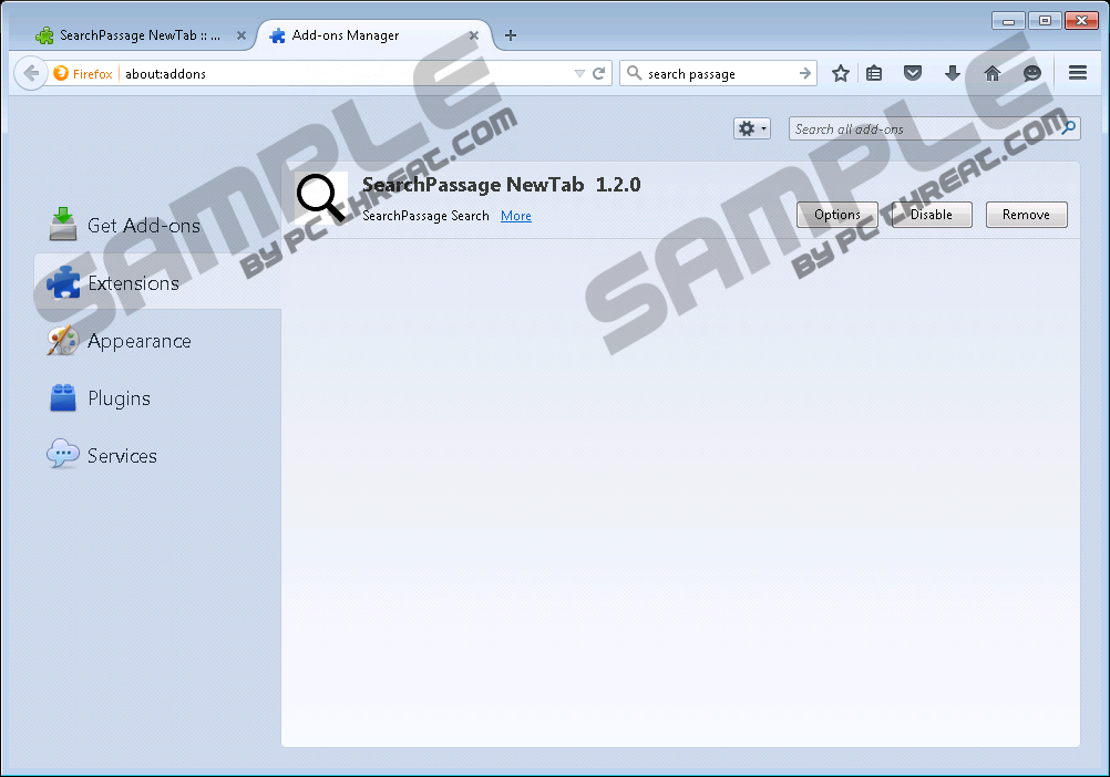 Nt.Searchpassage.comUnfortunately, Nt.Searchpassage.com may not travel alone as it should appear on your browser together with an extension that is called either SearchPassage or SearchPassage NewTab. The duo on your browser might gather information related to your browsing or display suspicious ads that belong to the third party. Our specialists researched the software and came to the conclusion that it might be potentially harmful. Nt.Searchpassage.com works only on Google Chrome and Mozilla Firefox, so you can use another browser for now or simply delete the search engine together with its extension. If you scroll below the article, you will find a step by step removal guide prepared by our specialists. The main reason we encourage you to learn more about the application and eventually delete it is because it could display advertising that comes from unreliable sources. For more information continue reading the text. Nt.Searchpassage.com might not only replace your search engine, but it could also set itself as your new tab page or homepage. Because it modifies these preferences on user’s browser, the search engine was classified as a browser hijacker. Apparently, the application could be distributed with bundled installers that are downloaded from unreliable web pages. If this is how you received the search engine and the mentioned extension, you should be more careful during the next installation process. Even if the installer is bundled with additional software, often users have a chance to reject it in the setup wizard. Another way to download Nt.Searchpassage.com and SearchPassage or SearchPassage NewTab extension is to visit searchpassage.com, which seems to be the software’s official site. The website has a download button, and if user clicks it, the browser might display a notification. The pop-up warns the user that the application might “read and change all data on the websites you visit,” “detect your physical location” and change your default homepage, search engine, or start page with Nt.Searchpassage.com. If you are downloading a legitimate application that was created by a reputable company and their goals are clear, then you might worry less about such warnings. However, when it comes to suspicious software such as Nt.Searchpassage.com, users should be more concerned about these pop-ups. Giving such rights to a potentially harmful program is not a good idea. According to the Privacy Policy provided on searchpassage.com the software “may collect information that can personally identify you, such as your name and email address, as well as other information that does not personally identify you. Collected data may be used, supplemented, and shared with other parties for business, commercial, or marketing purposes.” The document also states that this information could be used to display advertising-supported content, for market research, and other purposes described in the Privacy Policy. The worst part is that the ads could belong to unreliable third-party partners. This advertising content could be displayed in your search results or appear as pop-ups on other web pages. Probably, the software’s creators do not review what these ads advertise or where they redirect the user. If you would check the browser hijacker’s End User License Agreement, you would see that Nt.Searchpassage.com developers do not take any responsibility for any damages caused by “any computer bugs, viruses, harmful programs or similar mechanisms transmitted through or in connection with the extension, (d) loss or damage as a result of any reliance placed by you on the completeness, accuracy or existence of any advertising or third party content.” This means that the extension might be unsafe for you to use as well as the third-party advertising. If the software would have other functions besides showing suspicious ads, users could consider using it despite its flaws. However, since it does not do anything good for you, it is not worth to keep it on your browsers. Thus, users who do not want to waste their time with this irritating browser hijacker should delete it either manually or automatically. As we promised, the instructions below will show you how to get rid of the software. It seems that all you have to do is to erase the extension that is known as SearchPassage to Google Chrome users and SearchPassage NewTab for those who use Mozilla Firefox. If you download a trustworthy antimalware tool, you will be able to remove the browser hijacker just the same. Also, if you have other suspicious software on your system, the security tool will take care of it too. Thus, in a way, the automatic removal with an antimalware tool is more beneficial to your computer. Delete Nt.Searchpassage.comMozilla Firefox