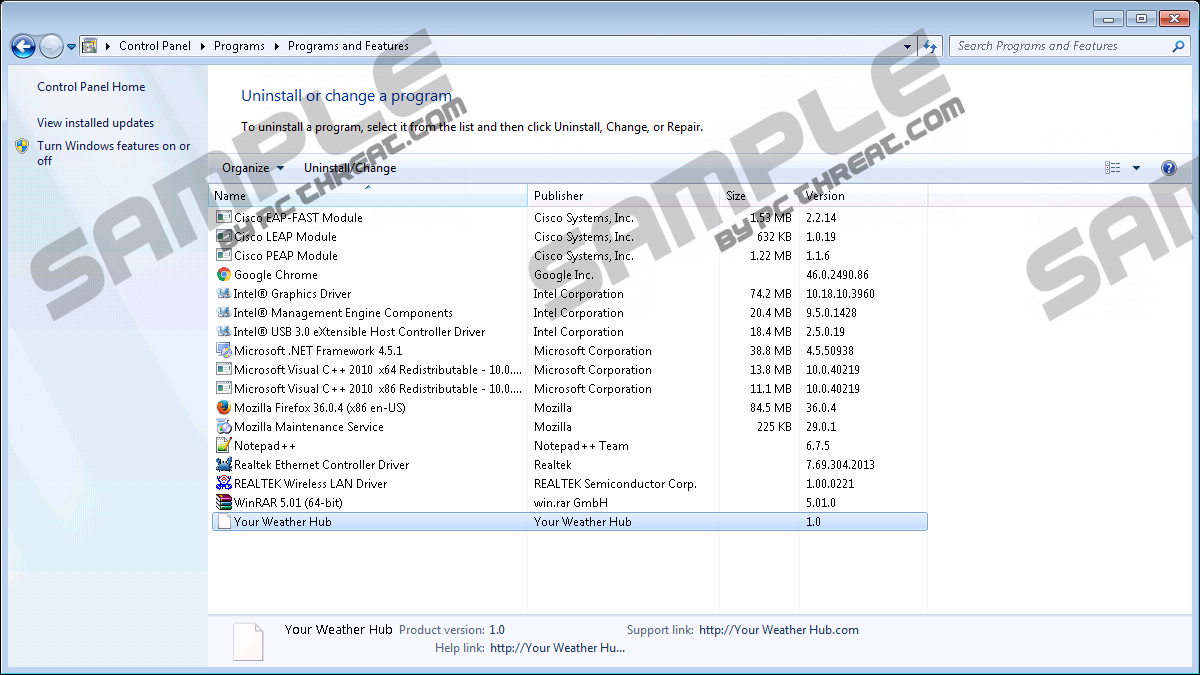 Search.yourweatherhub.comSearch.yourweatherhub.com falls into the category of browser hijackers because of its malicious dissemination method. You might want to remove this hijacker because it is more than likely that you got it unintentionally. From the outset, we want to clarify that it is part of a web monetization scheme which means that it is set to generate income from advertisements and promotional links featured in its search results. You might think that there is nothing to get worried about, but we want to point out that the chances are that some of those links can redirect you to less than legitimate websites. Indeed, you might run into some malicious content if you decide to keep it. Let us begin with its origins and methods of dissemination to gain some perspective of what you are dealing with. After visiting Search.yourweatherhub.com we were convinced that this hijacker was created by SaferBrowser, a company dedicated to producing browser hijackers. This developer releases browser hijackers without interruption. Some of its newer releases include hijackers such as Search.youremailnow.com, Search.searchtrmypa.com, Search2.searchlson.com, and Search.searchcads.com which were released just this past month. All of these hijackers come with dedicated extensions, and Search.yourweatherhub.com is no exception. This particular hijacker comes with an extension named Your Weather Hub. This extension is distributed via two channels. The first channel is a dedicated website at Yourweatherhub.com, which claims that the extension will provide you with weather forecasts right on your browser. However, this is just a front since this extension’s purpose is to replace your web browser’s settings. The second known method of dissemination is software bundling. We have received information that it is being bundled with third-party software and uploaded to freeware sharing websites. Since it comes bundled with various installers, we heard that the setup might inset Your Weather Hub into your browser without asking for your permission. Some installers might let you deselect its installation while other will force its content on your PC, and that is the main reason why we have classified Search.yourweatherhub.com as a browser hijacker. Now, let us jump into this hijacker’s functionality and discuss it in more detail. If you have installed Your Weather Hub, then we want you to know that apart from injecting this hijacker into your browser it does absolutely nothing. The weather-related toolbar found on Search.yourweatherhub.com is part of the site and is not part of the extension. Also, the said toolbar is not that useful because it is a collection of weather-related links that you can bookmark yourself. It is compatible with Microsoft Internet Explorer, Google Chrome, and Mozilla Firefox and is it configured to modify the settings of these browsers and replace their homepage address. Hence, this hijacker forces you to use it for processing the search queries that you enter into the search box. It is interesting to note that it redirects the search queries to a custom Yahoo search engine. However, it is not the same as the original Yahoo.com search engine because it can feature additional advertisements supplied by SaferBrowser’s advertising partners. Thus, we warn you that some of the presented links may be unreliable and outright malicious. Indeed, this hijacker can subject you to scam and phishing websites and sites that feature malicious software downloads. Therefore, it might jeopardize your computer’s security. We also want to shed some light on Search.yourweatherhub.com’s privacy policy. We have found that it is configured to gather non-personally identifiable information automatically and use it for marketing and advertising purposes. The collected information includes the search queries that you have entered, visited URLs, Internet Service Provider (ISP) information, Internet Protocol (IP) address, your approximate geographical location, and browser type, among other things. It cannot obtain personally identifiable information, but the company can collect it if you contact them. Any personal information you prove can be supplemented with non-personally identifiable information and used for the said marketing and advertising purposes. In closing, it is clear that Search.yourweatherhub.com is not set to benefit you but make money for its owners and their advertising partners since it has been configured to include promotional links in its search results. However, it has to hijack your browser to show you the ads which is unacceptable. Due to its malicious activities, you should delete. Feel free to use the manual removal guide found below. Uninstall via Control PanelWindows XP