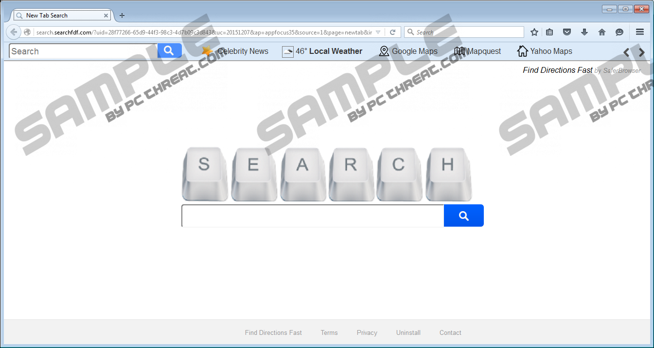 Search.searchfdf.comSearch.searchfdf.com is a questionable search website that can show up in your browsers after you install a browser extension called Find Directions Fast or a malicious software bundle. If you want to have quick links to online maps and directions, we do not advise you to use this tool because it may present to you potentially harmful third-party content. As a matter of fact, we have classified it as a browser hijacker due to its capability to change the homepage and default search engine settings. Hijacking does not necessarily mean that this happens without your permission, even though it is possible that you do not notice giving it. We believe that only few users would really install this tool knowingly and officially, if it is possible at all. Unfortunately, it is more likely that this browser hijacker enters your computer with other malware infections. Therefore, you should not take its presence lightly. In fact, we advise you to remove Search.searchfdf.com right now along with all other infections you may find on board. Unlike many of its peers, this browser hijacker actually has its own promotional webpage at finddirectionsfast.com. This is a rather simple page where you cannot even download or install this extension. Although there is a big “Get Started Now” button, for some reason it does not seem to function. So, as a matter of fact, there is no way for you to download it officially. How come it can still appear on your computer? Obviously, there has to be an alternative channel through which this browser hijacker can infect unsuspecting users. This channel is called software bundling. The biggest issue with bundles is that cyber crooks can use them to spread malware infections and potentially unwanted programs. All of these threats are actually capable of making your virtual security more vulnerable through exposure to unsafe websites, content, as well as cyber criminals (online scams). Therefore, it may come in handy to understand how you can infect your computer with such bundles. The most common way in general is to click on any unreliable web content, including third-party ads (banner, pop-up) and links. Such content can come from malware infections that can already be on your system, such as adware apps and browser hijackers, or from shady websites promoting an annoying number of potentially harmful third-party ads. Such webpages are usually freeware, torrent, gaming, and porn sites. It takes only one click for you to drop a bundle of threats onto your machine. So if you may have visited such sites or clicked on suspicious ads lately, we advise you to delete Search.searchfdf.com from and scan your system with a reliable online malware scanner to find out about the level of infection on your computer. When you install this browser hijacker, it changes the homepage and default search engine settings in your browsers to either Search.searchfdf.com or home.searchfdf.com depending on your browser. This infection mainly affects the three most popular browsers, including Mozilla Firefox, Google Chrome, and Internet Explorer. This way you can be introduced to potentially unsafe content every time you open one of these browsers or run a web search in them. This browser hijacker uses a redirection to display search results to you. Thus, do not be surprised to find yourself on a modified Yahoo results page that may contain unreliable ads and links promoted by this hijacker since this is the only way it can actually generate income. This is the usual downside of “free tools” because in a way you do have to pay the price; and it could be a risky one, too. What if cyber criminals can exploit this hijacker and pose as third parties? What if they can misuse the information this browser extension can gather about your online activities and show you relevant ads and links that you are more likely to click on. However, if you do click, you may end up on undesirable websites that are operated by crooks. If you do not wish to get scammed out of your money or lose your personally identifiable information to criminals, you should remove Search.searchfdf.com right now. It is possible that you can find an uninstaller in the installed programs list in Control Panel. Unfortunately, it may not clean up all the mess even if there is one. Therefore, it may also be necessary for you to reset your browsers if you find any leftovers. We have included instructions for these steps below this article. You can easily follow these and clean your computer of this useless tool even if you are not an advanced user. But you cannot forget about the potential other infections because those could cause further damage and vulnerability. We recommend that you download and install an authentic malware removal application to fully and automatically protect your computer. How to remove Search.searchfdf.com from WindowsWindows XP