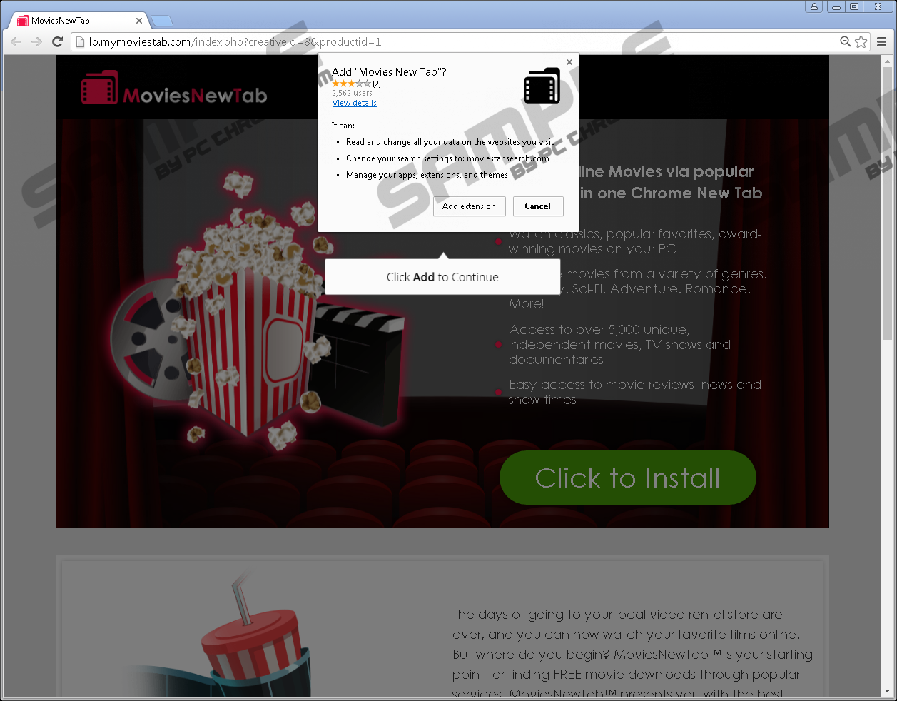 MoviesTabSearch.comDo not waste your time and delete an application which goes by the name of MoviesTabSearch.com if it is running on your personal computer. We highly advise you to do so because the devious program in question has been categorized as yet another browser hijacker which is fully capable of ruining your online experience in quite a few way. This is critical since on top of altering your online activities for the worse this hijacker could also turn out to act in a rather malicious way; in some cases, it could cause exposure of your operating system to suspicious third-party web content, which could lead to an infection. Read the rest of this article to understand why keeping MoviesTabSearch.com on your PC is a huge risk that no Internet users should take. You can get rid of this browser hijacker in just a few simple steps by following the comprehensive removal instructions that we present below. As soon as MoviesTabSearch.com enters your PC, it will cause major changes to your web browser's default settings, without any notification. It is important to note that at the moment this browser hijacker only affects the Google Chrome browser; thus, users using it as their default tool to surf the web should be much more aware of this malicious application. The invasive software in question alters the default home page and search engine. These changes have a significantly negative effect on your online experience because the hijacker forces you to use the home page that it set as your default one at all times. The same thing happens with your default search engine, meaning that all of your online queries will go through a newly appointed search provider whether you like it or not. These two seemingly irrelevant modifications of your web browser's default settings will change the way you experience the web, and it goes without saying that the experience will be ruined. All of these changes are caused by a browser extension that this hijacker implements upon its intrusion. If you want to surf the web the way you are used to, you will need to conduct a complete removal of MoviesTabSearch.com; otherwise, the unwanted changes will remain intact and will continue to interfere with your daily online activities. While such annoying and frustrating functionality of MoviesTabSearch.com should be more than enough to be a reason for its complete removal, you must be notified about the potentially malicious qualities of this browser hijacker. Our research team has discovered that using the newly appointed could prove to be potentially dangerous. It is so because you might be presented with modified search results. This means that some of them could turn out to be hosting redirect links within them; thus, by clicking on such a result, you risk of being redirected to some unknown third-party site. Landing on questionable web pages could prove to be rather detrimental since you might end up on websites hosting potentially harmful software. In other instances, your could be taken to fake online shops, which are created by cyber crooks for one reason only - to steal your credit card data. It is quite obvious that entering any of such sites could have devastating consequences. To keep your PC and your sensitive information absolutely safe and secure we advise you to delete MoviesTabSearch.com without any hesitation. The complete removal must be executed with care since missing a step or making a mistake could mean that the hijacker in question was not removed entirely. In some instances, leftovers could cause the hijacker to restore itself without any notification. In other instances, an incomplete removal could mean that the changes made by MoviesTabSearch.com could remain intact. To avoid finding yourself in such a situation, you must execute an in-depth analysis of your personal computer for potential traces linked to this browser hijacker. If you believe that such manual analysis of your computer might be a bit too challenging, you should simply scan your computer with a professional antimalware tool as it can detect and delete anything associated with MoviesTabSearch.com. How to remove MoviesTabSearch.com from your PCGoogle Chrome