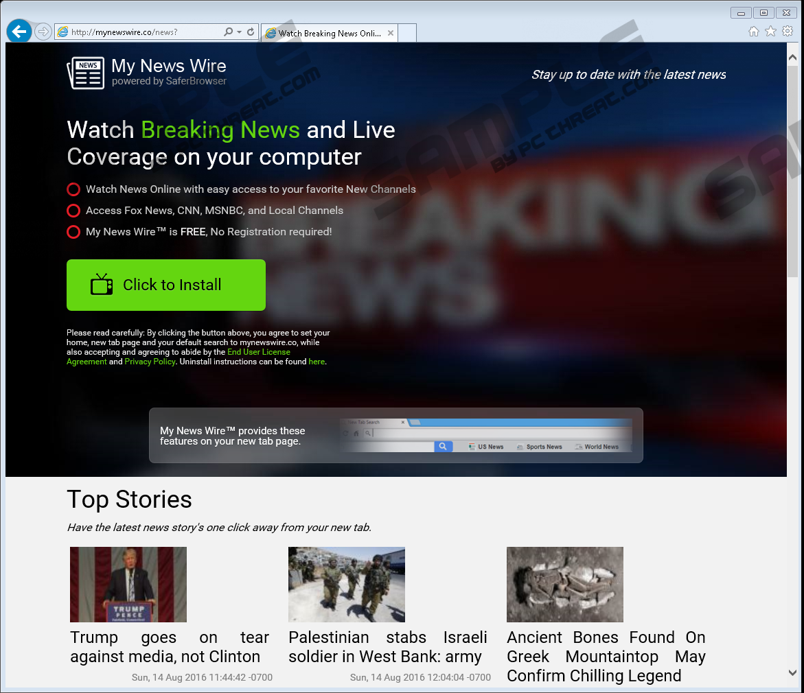 Search.mynewswire.coThere are far too many applications that look like they could offer you something useful, but in reality, they just slow down your system and expose you to dangerous content. Search.mynewswire.co is a browser hijacker that is part of such an application, and if you suddenly see this domain set as your default homepage, it means you have to scan your PC with a licensed antispyware tool immediately to figure out what potentially unwanted and dangerous programs have entered your system. Needless to say, you need to restore your browser settings and get rid of Search.mynewswire.co as soon as possible, too. According to our security researchers, the browser hijacker belongs to the SaferBrowser family. It means that there are many other programs similar to this search engine, and, at the first glance, it may look like fighting a swarm of locusts. However, there is always a bright side of dealing with infection families. When there are a lot of similar programs, it means that basically all of them are based on the same principle. Thus, whatever methods you used to remove the older members of the SaferBrowser family, the same methods can be applied to Search.mynewswire.co, too. Just scroll down to the bottom of this description for the manual removal instructions. Continuing from where we left about the SafeBrowser family, we can tell that the setup of this browser hijacker is signed by “Sail Machine,” and the program is practically identical to Search.searchlen.com, Search.searchlttrn.com, Search.yourpackagesnow.com, and many other programs from the same group. It also means that it employs the same means of distribution, and you will find this hijacker on your browser completely unexpectedly. Some people may point out that the main program that installs this hijacker (My News Wire) is not a malicious infection because it has an official homepage. It is true that you can access the homepage via mynewswire.co/news?, but the question is whether you really need such an application. Technically, it says that with this browser extension you can “watch Breaking News and Live Coverage on your computer.” So it should turn your browser into a TV station that broadcasts news 24/7. It also says that you should be able to “watch News Online with easy access to your favorite News Channels, access Fox News, CNN, MSNBC, and Local Channels,” and so on. Of course, it “forgets” to tell you that the extension also adds the search engine to your Internet Explorer browser, but that is already another story. What we would like to point out is that browser hijackers seldom get installed via original sources. In fact, it is far more likely that you got Search.mynewswire.co added to your browser via a malicious pop-up. These “malicious pop-ups” are usually generated by various adware and potentially unwanted programs that are running on the affected computer. Therefore, your computer must have been infected with potentially harmful software before this browser hijacker even entered it. This is where we would like to remind you the importance of regular system scans. Running a powerful antispyware program once in a while would definitely lower the risk of getting infected with dangerous threats. Of course, this browser hijacker is not the most dangerous thing you can encounter on the web. In fact, it is there to make money by redirecting you to affiliated websites. For the most part, this kind of behavior is more annoying than dangerous, but in some cases, browser hijackers could be exploited by cyber criminals to promote their content. If you are not an experienced computer user, you may not even notice the difference between reliable and customized search results. Thus, you need to protect your computer before the situation falls out of hand. Remove Search.mynewswire.co right now and then scan your PC with the SpyHunter free scanner, as you definitely have more than one unwanted application on-board. When you have all the potential threats detected, delete them all automatically with a licensed antispyware tool. It will also be an investment in your future: A computer security tool of your choice will definitely protect you from serious intruders that might try to slither into your system when you expect it the least. Finally, you can always leave us a comment if you have any further questions. We need to YOUR feedback to improve, too. How to Remove Search.mynewswire.co