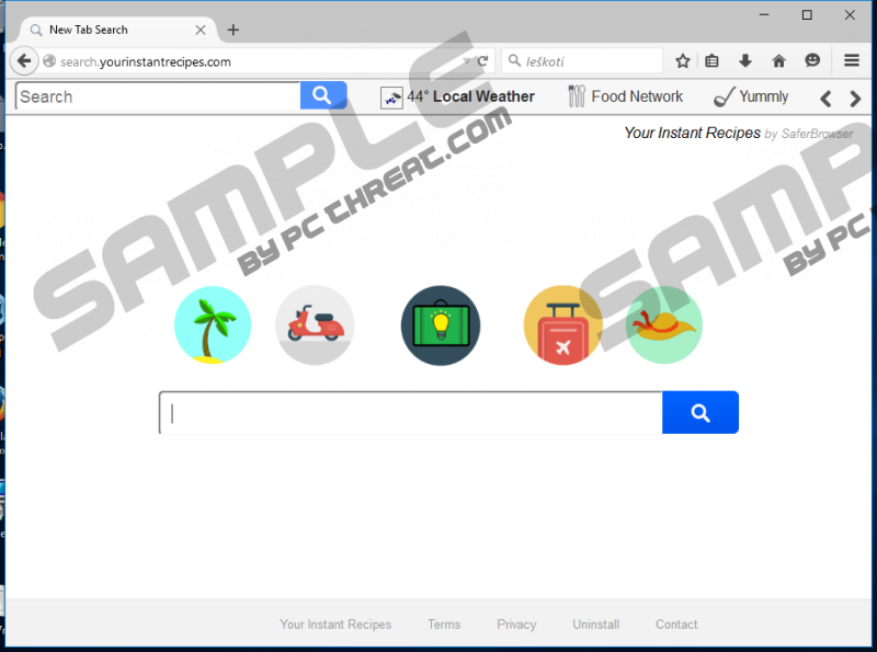 Search.yourinstantrecipes.comSearch.yourinstantrecipes.com is a new questionable search engine page that can show up in your Mozilla Firefox and Internet Explorer browsers after you let a browser hijacker on board. This threat does not seem to affect Google Chrome for some reasons. We have found that this hijacker is practically identical to other well-known risky search engines coming from the same family, including Search.searchsmg.com and Search.searchyff.com among many others. The only goal to create such a search engine is to direct web traffic to affiliated websites through modified search results and third-party advertising. This makes this search engine potentially risky since cyber criminals can easily exploit it. If you do not want to let more malware infections onto your system or become a victim of online scams, we recommend that you remove Search.yourinstantrecipes.com from your infected browsers ASAP. Most users may not even know how easy it is to install a browser hijacker without even noticing it. A lot of times you may even think that this happens silently, without your permission. Although it is possible for some more intrusive hijackers to crawl onto your system without your knowledge, we must tell you that this usually happens with your approval actually. This malware infection, for example, can show up in your browsers after you click on corrupt third-party advertisements, such as banners and pop-ups that could be generated by adware programs or browser hijackers as well. The installation of this hijacker can take place directly after you click on an ad, but you could also drop a bundle of threats onto your system at the same time. When you install a bundle, you may be informed about the contents that you are about to install, including Search.yourinstantrecipes.com. However, this may only be revealed to you if you read the license agreement carefully or you choose the custom installation option instead of the quick one. But you may also be exposed to unreliable third-party ads by viewing shady file-sharing websites, including torrent and shareware pages. These sites are usually packed with questionable third-party contents, such as banner and pop-up ads that can be rather misleading. If you land on an unfamiliar website, it is quite easy to click on fake buttons, for instance. While you may think that you clicked on a download button, you could drop a bundle of malicious installers onto your computer or get redirected to malicious sites that can scam you or trick you into believing that you need to download an urgent software updater and so on. All in all, if you find this browser hijacker in your browsers, you need to scan your system with a trustworthy malware scanner to identify all possible threats after you delete Search.yourinstantrecipes.com from your browsers. This questionable search engine offers you a fake toolbar with a search box and a number of quick links to food and cooking-related third-party websites, including recipessimplified.com. Landing on the related websites might be risky for you as this hijacker might inject third-party ads into these sites that could take you to malicious websites when you click on them. Another threat source is the search engine itself. We have found that this infection may modify the search results of your queries to include third-party ads and links to promote affiliates, i.e., to generate income from advertising third parties. Since this browser hijacker can also collect information about your browsing habits, it is possible that you will find totally relevant ads and promoted pages that seemingly match your desires, too. Keep in mind that even though you end up on a Yahoo search results page every time, these relevant-looking ads might come from cyber criminals who simply want to lure you onto their malicious websites to scam you or to infect your machine with more threats. If you do not want to lose your banking details or your identity to criminals, we suggest that you do not hesitate to remove Search.yourinstantrecipes.com from your computer. If you are ready to act, we recommend that you reset the affected browsers to make sure that all components of this attack are eliminated and your browsers are all set to default. This infection may change your home page, new tab page, and default search engine settings so you could also try to undo these modifications one by one manually if you do not want to lose your preferences or installed extensions by resetting your browsers. Please follow our instructions below if you do not know how to reset your browsers. If you want to defend your computer efficiently and more powerfully, we advise you to consider using a professional security tool, such as an anti-malware program. How to remove Search.yourinstantrecipes.com from browsersInternet Explorer