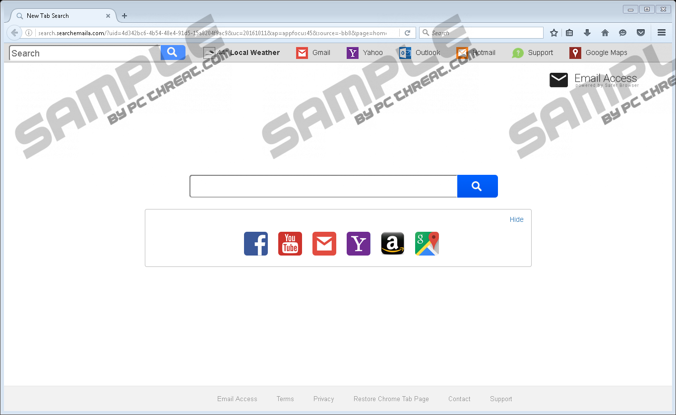 Search.searchemaila.comIf you open any of your browsers and see that a search tool Search.searchemaila.com has changed your search engine (on Mozilla Firefox only), homepage, and even the New Tab page settings, there is no doubt that there is a browser extension from accessyourmails.info installed on browsers. You might have downloaded it from its official website willingly, or it could have been added to all your browsers when you have clicked on a malicious pop-up advertisement. Either way, it acts completely the same. We think we know why you have installed this extension if you have done that willingly. It has become immediately clear for us after visiting its official website that people install this piece of software because they believe that it can enable them to login to their emails in the blink of an eye. People do not know how the program really works, and they usually do not even notice the information about the changes it is going to apply to browsers. We highly recommend getting rid of the browser extension if you cannot stand Search.searchemaila.com. It would be best to do that also because this search tool is not very trustworthy and might expose your system to potential threats. You will know exactly what you have to do to delete this software fully from the system if you read this article from beginning to end. Search.searchemaila.com is not a very harmful search engine, but it is not advisable to keep it installed on the computer too because it has been found that it might provide users with the commercial content if they use it to find the relevant information on the web. In other words, you will be provided with advertisements – they will appear on the same page next to reliable search results. Many users find it quite surprising when they hear that Search.searchemaila.com shows ads because they see that this search tool is powered by Yahoo!. No, it does not mean that Yahoo! cannot be trusted. This only shows that the developer of Search.searchemaila.com has modified this legitimate search engine to be able to insert ads. Sooner or later you might notice that you need more time to find the information on the web due to the presence of advertisements. In addition, you need to know that these sponsored search results might take you to unreliable third-party websites containing untrustworthy software. The developer of Search.searchemaila.com informs users that it is not responsible for any harm these third-party websites might cause in advance, so you are the only one who can protect your PC. According to security specialists working at pcthreat.com, you will be 100% safe only if you delete Search.searchemaila.com fully from your browsers. You should not let Search.searchemaila.com stay on your browsers if you do not want to reveal information about yourself to the developer of this Safer Browser extension (the extension is said to be “powered by Safer Browser”, but its setup is signed by Sail Machine). If you do not do anything, it will gather URLS, search queries, browsing history, links clicked, and other details associated with your Internet browsing activity. This information is considered to be non-personally identifiable; however, if you pay closer attention to the information written in the Privacy Policy, you will find out soon that some of these non-personally identifiable details, for example, search queries “may contain personally identifiable information.” All the gathered data will be, of course, shared with third parties, so if you wish to feel safe, you have to remove the extension fully from your computer. Of course, you might encounter a similar infection again if you do not have security software installed on your computer, so hurry to acquire the reputable scanner if your system is unprotected. An automatic tool will ensure the maximum protection of your system 24/7/365. There are several different ways to delete Search.searchemaila.com; however, the quickest one is to reset browsers to their default settings. Of course, it is not as fast as the automatic removal method, so we suggest deleting the unwanted software automatically if you do not want to spend your valuable time on this process or simply do not know where to start. All you need to do is to scan your computer with an automatic malware remover, such as SpyHunter. This security software (the diagnostic version) can be downloaded from our website too, so feel free to do that. Delete Search.searchemaila.comMozilla Firefox