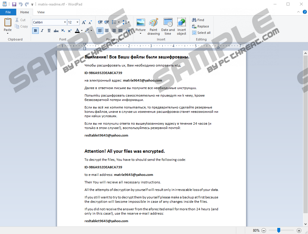 Matrix9643@yahoo.com RansomwareIf your PC gets infected with Matrix9643@yahoo.com Ransomware, you should immediately think about its removal because it is a really nasty infection. The first symptom showing that this threat has successfully entered the computer is the inability to access the majority of files stored on the computer. Specifically speaking, files located in such directories as %USERPROFILE%\Desktop, %USERPROFILE%\Downloads, %HOMEDRIVE%\$Recycle.Bin, and %HOMEDRIVE%\{1-6} (a folder name consists of 1-6 characters) are found and encrypted by the ransomware infection. Matrix9643@yahoo.com Ransomware encrypts files, just like other malicious applications that are placed into the category of ransomware, in order to obtain money from users. In fact, unlike a bunch of other similar threats, it does not tell users that they will have to pay a ransom to get a decryption tool. Users are only told that they have to contact the author to “receive all necessary instructions.” Do not pay a single cent to cyber criminals since the chances that the decryptor will be sent to you are not very high. Matrix9643@yahoo.com Ransomware does not immediately start encrypting users’ files. As has been found by researchers working at pcthreat.com, this infection collects all the relevant information about a victim’s computer first, for example, OS, Service Pack, drivers, architecture, and other details. The collected information is then stored in .mth files created on Desktop. Only then the encryption process starts. As has been mentioned in the first paragraph, this ransomware infection locks a bunch of different files stored on the computer. They will all receive the new filename extension .MATRIX, so it will definitely not be a problem for you to find them. Once the encryption process is finished, Matrix9643@yahoo.com Ransomware drops a ransom note matrix-readme.rtf (it might have numbers at the beginning too, e.g. 31217-matrix-readme.rtf) in different places these encrypted files are located. Since there are two versions of ransom notes (one in Russian and the other one in English), specialists say that this threat might be of a Russian origin. No matter which ransom note users read, they get the same information: an email with the provided ID has to be sent to matrix9643@yahoo.com (or redtablet9643@yahoo.com, if the answer is not received within 24 hours) to get instructions on how to decrypt files. Even though it is not written in the ransom note, researchers are sure that the author of this infection will demand a ransom. Its size might vary, but the decryption tool will definitely not be cheap. Also, there are no guarantees that it will be sent to you after you make a payment, so you should definitely weigh all the pros and cons before transferring the required money. If a decision not to pay money is made, you can go to recover your files from a backup you keep on an external storage device. Unfortunately, a third-party data recovery tool will, most probably, not help you because Matrix9643@yahoo.com Ransomware creates a script that removes the so-called Shadow Copies of files. Yes, this threat is a dangerous one. Even though Matrix9643@yahoo.com Ransomware is said to be a Russian ransomware infection, it targets all users no matter where they live. To be frank, the possibility to get infected with this threat is not very small since it is distributed through spam emails. Research carried out by experienced specialists recently has shown that the malicious file comes as an email attachment in most cases, and users open it without fear because it looks harmless. This is, undoubtedly, the most common ransomware distribution method; however, it does not mean that these threats cannot be spread somehow differently too. Therefore, the installation of a security application is a must. Do not forget to enable it and update periodically to be safe 24/7. It is not a piece of cake to delete Matrix9643@yahoo.com Ransomware from the computer because it drops several files on the infected computer. We understand that these files might not be very easy to detect and erase, so we asked our specialists to prepare the manual removal guide for you. You can find it below this article. Of course, it is not the only method to erase this ransomware infection. You can automatically delete this threat from the system too. Use the SpyHunter antimalware suite – it will remove other threats, e.g. adware, browser hijackers, and potentially unwanted programs performing activities on your PC without your consent as well. Keep in mind that it, unfortunately, cannot unlock files for you. Delete Matrix9643@yahoo.com Ransomware manually