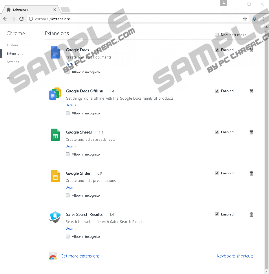 SaferSearchResults.comIf your web browser's default settings were altered without your consent, it could be the doing of a program entitled SaferSearchResults.com. You must know that this application has been classified by malware experts at our internal labs as one more intrusive search engine that you should avoid at all times. This is important even though this program could be advertised as a useful tool that should improve your overall online experience. While it might sound tempting to have it, you must know that in reality, this devious piece of software does not exhibit valuable features; instead, of enhancing your daily online activates it will ruin them. To restore your web browser's default settings so you can surf the web the way you are used, make sure to thoroughly delete SaferSearchResults.com from your PC once and for all. Do so by following the detailed removal instructions that we provide below. SaferSearchResults.com exhibits quite a few intrusive features, to put it lightly. Once it enters your operating system, it will install a suspicious third-party extension that should help you with your online queries. Unfortunately, this is not what will actually happen; in reality, the devious extension will trigger unwanted changes to your web browser's default settings. The main two alterations induced by this dubious program are of your default homepage and new tab page. All the modifications are made without any notification, which is annoying, to say the least. Even though it might not seem like much, you will gradually understand how invasive and frustrating these alterations actually are. Essentially, for as long as this undesirable search engine will be active on your operating system, you will be simply forced to use a devious third-party website as your default homepage whether you like that or not. Virtually the same thing will happen in regards to your new tab page; instead of being presented with a blank page once you open a new tab within your browser, you will be provided with a dubious site. These changes will alter the way you experience the web and that change, unfortunately, will not be a positive one. It is critical to delete SaferSearchResults.com from your PC once and for all since that is the only way that you can restore your web browser's default settings, meaning that you will be able to browse the web the way you like once again. Unfortunately, annoying features are not the worst thing about SaferSearchResults.com. Our research team has discovered that in some instances this dubious search engine might subject your operating system to suspicious and even potentially harmful web content. This could happen if you chose to use a questionable search field that is presented within the newly appointed homepage. During the analysis of results, it has been found that some of them could prove to be hosting redirect links. This means that clicking on such a result could lead you to dubious third-party sites that might not be related to your original online query. The worst thing about all of this is the fact that in some cases you could be redirected to potentially dangerous web pages. For example, you could be redirected to sites that might host malicious software. Sometimes, sites designed by malware developers might have an active arbitrary code execution exploit; in quite a few situations, just entering a site that has this particular exploit running on it, will result in a system infection. It goes without saying, that our research team advises you to refrain yourself from using a devious search field. It should be self-evident that SaferSearchResults.com is a major virtual threat, that should not be tolerated under any circumstances. Do not waste your time and get rid of this invasive program as soon as it is found up and running on your personal computer. The removal guide that we present below must be executed with extra care since a single mistake could prove to have unwanted outcomes; it could result in an incomplete removal of SaferSearchResults.com, which means that invasive changes might remain in full tact. In order to be sure that its every single bit has been removed successfully, you need to perform an in-depth analysis of your PC for traces linked to it. Such analysis should be executed as soon as you are done with the manual removal. If you find all of this too complicated, to not hesitate to use a reliable antimalware tool for all of your removal procedures as it can delete everything linked to SaferSearchResults.com in an automated manner. How to remove to SaferSearchResults.com from your personal computerGoogle Chrome