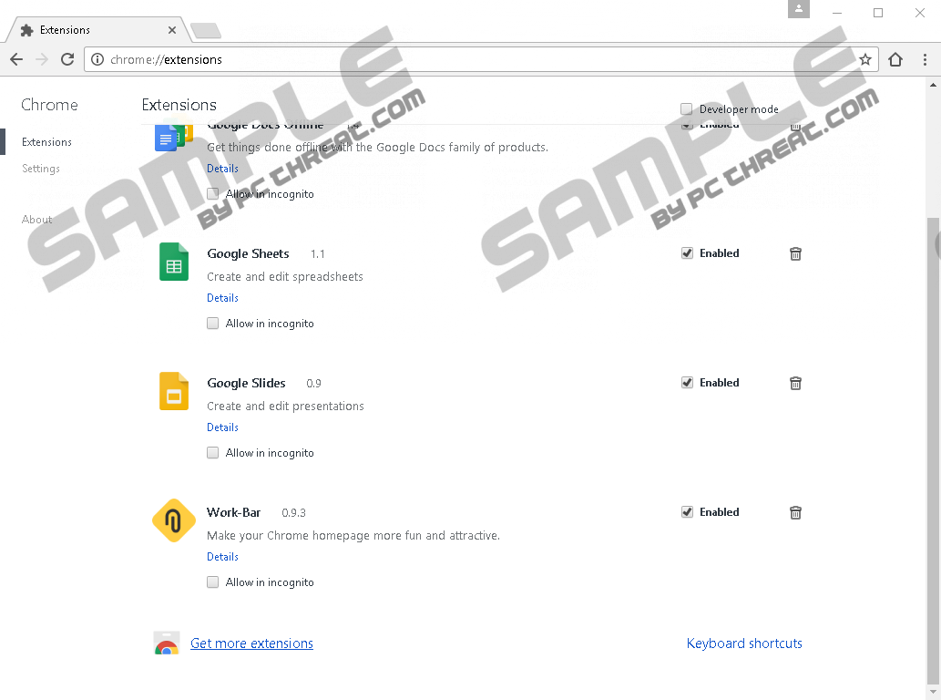 Work-BarWork-Bar is a browser extension that can modify the settings on the Google Chrome web browser, and that is why it is often recognized as a browser hijacker. On the official download page, work-bar.biz, this tool is represented as the “New Tab and Homepage for Chrome.” Because the official installer did not work, we moved to the Chrome web store at chrome.google.com/webstore/detail/work-bar/hofngijjpilmembpgefopjcfiimkdkhi to acquire the extension. This version of the add-on did not modify the homepage; however, it changed the New Tab to represent “chrome-extension://hofngijjpilmembpgefopjcfiimkdkhi/newtab.html”, which is very odd. If these are the modifications you have encountered, it is most likely that you need to remove Work-Bar from your web browsers. Please keep reading to learn all that you need to know. Although an official source exists, it is unlikely that you have used it when downloading Work-Bar. It is much more likely that you have found out about this extension when downloading a different application. Third-party installers that often offer free versions of desirable software usually do so to push users into downloading other suspicious programs. Maybe you installed something you were after along with a bunch of unreliable programs that now require removal? Do not rush to say that your PC is clean because, in some cases, malware can slither in without any notice. Please install a legitimate malware scanner to help you inspect your operating system and find out if malicious infections exist. Needless to say, if you uncover malware, you must delete it ASAP. Hopefully, a scanner will detect only one threat, the suspicious browser hijacker, and you will be able to focus on it alone. According to our research, Work-Bar was created by Via Advertising Group Limited, a company that has released playbar.biz, play-bar.net, magic-bar.net, and solo-bar.biz hijackers. After analyzing the Privacy Policy prepared by the company at work-bar.biz/policy.php, our suspicion is that the main goal behind the extension/hijacker is to introduce you to third-party content. For example, one of the statements informs that Via Advertising Group Limited might “conduct surveys and contests.” Do you want to be flooded with suspicious surveys and prize giveaways while browsing the web? We are sure that you do not. What about potentially unreliable and useless search results you might encounter while searching? That might happen. Although the search tool represented via Work-Bar redirects to Google Search, do not be misguided by the results shown. They could showcase ads, and that might be the doing of the suspicious hijacker. When Work-Bar takes over the New Tab, it displays a search dialog box, and we already know that using this search tool is possibly dangerous. Besides that, the tool also shows the time, your location, and weather. Also, there is a possibility to change the background color. Although these features are useful, it would not be right to call Work-Bar useful. If you pay attention to the information on the official website, this app is meant to provide you with “useful functionality,” but that is not the case. Obviously, that is an important reason to remove this add-on as well because you do not want to waste any time with useless tools. The web is full of useful apps that can make your experience more enjoyable and efficient, and you do not have to stick with the inadequate ones. Use the guide below to delete Work-Bar from your Google Chrome browser, and do not worry if this is the first time you are eliminating an extension because this task is very simple. After you are done with this part of the removal, scan your PC – if you have not done this already – to check if you need to delete any other threats. If they are more complex than the extension, you might want to employ the help of an automated anti-malware tool. Do not hesitate to invest in this tool if you also want to have your operating system and browsers protected in the future. If you already own security software, it might be high time you upgraded it. Work-Bar Removal