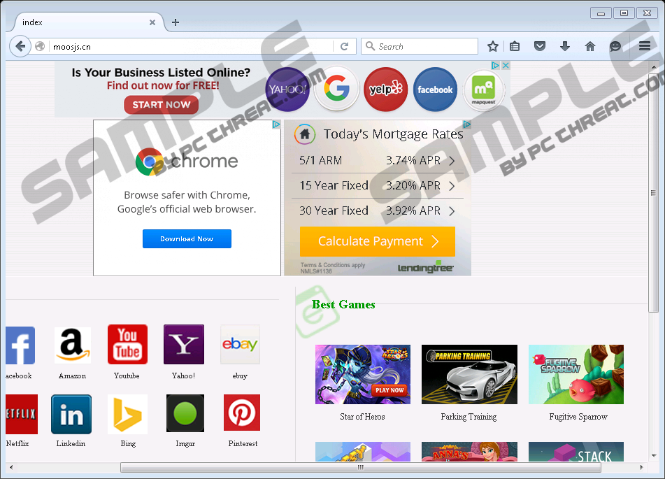 Moosjs.cnMoosjs.cn is a browser hijacker of a Chinese origin. There is no doubt that it can affect all browsers, except EDGE, so it is not at all surprising that there are so many users’ complaints regarding the presence of this undesirable website. It does not seem dangerous at all at first glance because it contains quick access links allowing users to open eBay, Pinterest, Facebook, Amazon, and other pages quicker. On top of that, several free online games are promoted on the right side of the page. Even though Moosjs.cn looks like a website that can be trusted at first sight, in reality, it is an infection that has replaced yeabests.cc and yeabd66.cc. The majority of people who have discovered this website on their browsers live in India, Indonesia, Egypt, Brazil, and Saudi Arabia. Even though this browser hijacker is quite a new infection (it was first detected on the 22nd of December, 2016), there is a number of infected users already. If you are one of them, go to delete Moosjs.cn as soon as possible. Unlike other browser hijackers, its removal will be complicated. It might really seem that Moosjs.cn is a harmless website; however, specialists working at pcthreat.com definitely cannot call this page trustworthy. Even though it does not look dangerous, it is full of advertisements. Links promoting third-party websites might be found on this page too. Both these promotional links and advertisements are quite dangerous in a sense that they might redirect users to untrustworthy websites that might promote anything. Yes, you might even find malicious software on these third-party websites. Such websites set by browser hijackers also often record what users do on the web. In other words, they seek to find more about users so that more relevant commercial content could be displayed. Believe us; it is definitely not done for your convenience. Instead, the developer of a browser hijacker wants users to click on those ads and promotional links because they get money for promoting third-party websites. There are a number of different browser hijackers spreading through the web these days. Even though Moosjs.cn is one of them, it differs from these ordinary hijackers that only change homepages, search tools, and New Tab pages on all browsers after the infiltration on the computer. Specialists have found that this computer infection uses the Windows Management Instrumentation (WMI) script. In other words, modifications are made on the computer so that Moosjs.cn could be loaded for users when they double-click on shortcuts of their browsers. Unfortunately, this also means that it will be a real challenge to eliminate this computer infection from the system fully. Moosjs.cn is quite a serious computer infection if compared to similar threats. It is because this browser hijacker is usually dropped by a Trojan infection on the computer. A Trojan infection itself might be waiting on websites offering free software. Also, they might be distributed as email attachments. In most cases, they travel inside spam emails. It will become clear quickly if malware promoting Moosjs.cn enters the computer because this web page will become immediately visible on all browsers. Keep in mind - similar threats, e.g. yeabests.cc and yeabd66.cc exist, and they might sneak onto your computer again if you are not careful. Our security specialists do not think that it is a good idea trying to protect the computer from malware without the special tool, especially if a user is inexperienced. Therefore, they recommend installing a reputable security application to make sure that malicious software cannot find any security loophole to get in. Being careful with free applications on third-party websites is also highly recommended. Since Moosjs.cn uses the Windows Management Instrumentation script, it is extremely hard to delete it. According to specialists, external tools are needed to do that. We do not think that you are a very experienced user if you are reading this article, so we do not recommend going to remove this browser hijacker yourself manually. Instead, you should acquire a reputable antimalware scanner, e.g. SpyHunter. It will remove Moosjs.cn from all browsers and will also make sure that a Trojan infection that has dropped this threat on your computer is gone too. Delete Moosjs.cn