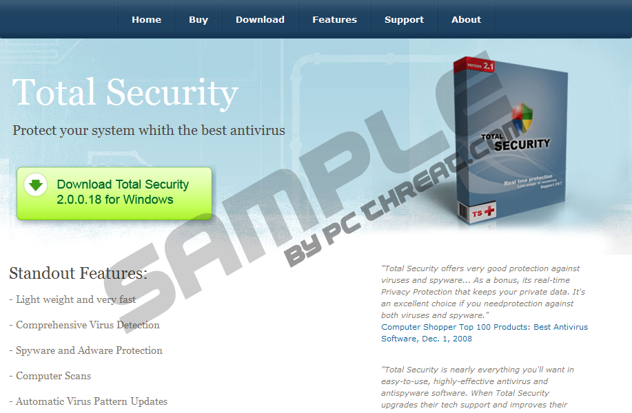 PowerfullAntivirusProduct.comPowerfullAntivirusProduct.com is a hazardous hijacker capable of disabling normal operating of your web browser and infecting your PC with its attendant rogue anti-spyware. PowerfullAntivirusProduct.com is known to promote Total Security fake spyware removal tool. Being diverted to PowerfullAntivirusProduct.com website usually takes place as a result of a Trojan infection. These Trojan intruders can bypass system authentication obstacles and get inside totally imperceptibly. Then, the browser will be illicitly reconfigured to get you to PowerfullAntivirusProduct.com site more than often. On PowerfullAntivirusProduct.com, you will view an imitated system scanner that runs inside a window entitled “My computer”. This scan will report a wealth of infections that are claimed to jeopardize your PC security and privacy. In order to get rid of these infections, you will be recommended to purchase Internet Total Security registered version. The fact is PowerfullAntivirusProduct.com is an annoying browser hijacker that will keep diverting you to this URL until you remove it. In addition, Internet Total Security is a rogue anti-malware program developed to mislead people, so it cannot be trusted and should be eliminated once detected. |
