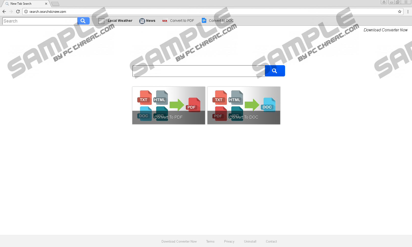 Search.searchdcnow.comSearch.searchdcnow.com is yet another product created by Polarity Technologies Ltd, and new hijackers from this family emerge practically every single day. Other mentionable examples include Search.searchmpct.com, Search.searchlypackage.com, and Search.searchpackaget.com. The company is creating hijackers so fast that mistakes are being. For example, at the time of research, the terms of use statement representing it was routing to http://search.searchfindactivec.com/home/terms, which, of course, is associated with a different hijacker (search.searchfindactivec.com). All in all, the hijackers tat come from this family share the same terms of use and privacy policies, and so this does not make much difference. As you might have figured out by now, we advise deleting all of these hijackers. Luckily, you can remove Search.searchdcnow.com even if you are inexperienced because this threat is quite straightforward. Most hijackers created by Polarity Technologies have unique extensions to represent them. The suspicious Search.searchdcnow.com is represented by Download Converter Now, and this name is shown on the top right corner of the home page as well. The same extension is also linked to Search.searchdconvertnow.com, which is another hijacker created by the same company. This add-on is officially represented at downloadconverternow.com, and it is also available from Chrome users via the Chrome web store at chrome.google.com/webstore/detail/download-converter-now-v3/dbofppkdkmlgookecegpliobonpnabnk. Have you acquired this extension from any of these sources? It is most likely that you have not. According to our research, software bundles could be used to promote this suspicious add-on. Do you understand what this means? Unfortunately, it means that Search.searchdcnow.com could come bundled with other programs that might be malicious and might require removal. We advise using a malware scanner to find out. As you can tell by the name of the extension representing Search.searchdcnow.com, it has something to do with file converting. In fact, this hijacker represents the services of cloudconvert.com, and these services are legitimate and reliable. Despite that, the “Download Converter Now” links does not work, which is kind of a nuisance. Besides offering that, the hijacker also offers the service of web browsing. This is where this suspicious tool becomes suspicious. First of all, it redirects to a third-party search engine without any warning, and it does not matter that you are redirected to Yahoo Search. Second, as our researchers warn, the results shown to you could be modified to showcase sponsored links. Can they be trusted? You should not rely on that. In fact, because there is a risk that security backdoors could be opened via the links shown to you, we advise deleting Search.searchdcnow.com immediately. You also should not trust Search.searchdcnow.com because it might record information that you might want to keep safe. Users are informed via the Privacy Policy that personally identifiable information could be recorded if users enter it when using the search tool. Does that mean that the hijacker can record all data that you enter, including login information? We cannot confirm that, but do you want to take the risk? There are hundreds of more reliable and useful search engines out there, and you can convert files using much more reliable software. In general, we believe that there is no purpose to keep this infection active because it does not offer exclusive services. On the contrary, it might do you a disservice by putting your security at risk. If you are completely inexperienced, you might not know how to change the homepage URL. Well, that is easy to do, and you can follow the instructions below. Because the hijacker targets Chrome, Firefox, and IE browsers, we show how to modify the homepage on these browsers; however, if you are trying to delete it from a different one, let us know in the comments section below, and we will assist you right away. Overall, the task is easy, and we are sure that you can have Search.searchdcnow.com deleted in no time. What about other infections? If they exist, research them one by one to learn how to erase them, or install anti-malware software that can simultaneously erase all infections at once. We support the latter option because anti-malware software also acts as security software ensuring that malware cannot slither in again. Search.searchdcnow.com RemovalInternet Explorer: