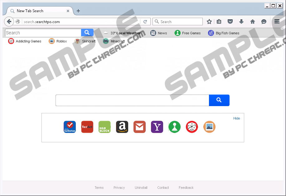 Search.searchtpo.comIt is possible that a new risky search engine, Search.searchtpo.com, simply appears in your browsers when you launch them and you do not even recall setting it as your homepage. This search page can emerge in your browser after a browser hijacker manages to slither onto your system. This can happen either with or without your knowledge. In any case, we have categorized this threat source as a browser hijacker because this category mainly relates to the fact that such an infection can alter certain browser settings. We have found that this particular hijacker may only change your homepage in the affected browsers, Google Chrome, Mozilla Firefox, and Internet Explorer. Still, this malware infection may present to you just enough harmful content that could cause additional system security issues, not to mention the possibility that other malware infections have also managed to infiltrate your system. Although these infections may not be the most dangerous ones you can encounter, we still believe that they can influence the operations of your system just enough to cripple it before long. This is why we recommend that you remove Search.searchtpo.com and every other questionable program you can detect on your PC. There is no official or promotional webpage that would make this search website available for you to download as a standalone browser extension. In fact, it has mainly been found distributed in free software bundles. Such software packages however can contain several surprises in the form of potentially unwanted applications and malware programs, including browser hijackers, bad toolbars, fake alerts, and adware programs. This is why it is vital that you always make sure that you are aware of the full content of a bundle before installing it. You can and you should, for example, always read the license agreement carefully because sometimes this is your only chance to know what additional changes or installations may take place, and make sure that you choose the custom installation method if it is offered. A browser hijacker can easily slither onto your system when you overlook the checkbox relating to the browser setting changes. Such a checkbox is usually ticked by default to make sure that if you ignore it or cannot notice it in time, you would install such changes and tools sort of without your knowledge. You can download such bundles after you click on unsafe third-party ads or modified search results when searching through a questionable search website possibly offered or installed by a browser hijacker such as this one. Unreliable third-party ads can appear on your screen if you have infected your machine formerly with ad-supported programs and hijackers. Also, when you end up on a shady website, such as a torrent, a shareware, a gaming, or a porn-related page. These sites are notorious for hosting questionable and annoying third-party ads that can be flashy banners, pop-ups as well as hidden and disguised ones (e.g., buttons). When you land on a page that you are unfamiliar with, you may not realize which content is safe to click on. This is how most users infect their machines. So, if you find this browser hijacker as your new homepage in your browsers, chances are there are other malware threats hiding on your system, too. For this reason, we suggest that you delete Search.searchtpo.com and find a trustworthy online malware scanner to detect all other possibly harmful programs as well. Similarly to Search.searchdirex.com and Search.searchicc.com, which come from the same family of hijackers, this malware infection also provides you with a pseudo-toolbar that features a search tool, an easy-access link to a local weather widget page, one to a questionable news page (news.mynewswire.co/) and a couple of links to gaming-related pages. You should know that this local weather page is packed with potentially unreliable third-party ads just like the gaming pages may also host such ads. Clicking on unreliable ads could further increase the vulnerability of your system to malicious attacks. Thus, we advise you not to use these at all. The same goes for the search engine as well since it could present to you manipulated Yahoo search results. Since you find yourself on a Yahoo search results page, you may believe that it is safe to click anywhere as you are on a reputable page. This is exactly why such hijackers mainly use this kind of redirection technique. But the truth is that the results may include potentially harmful third-party ads and links coming from unreliable sources, such as cyber crooks. If you click on such content, you may infect your system with another hijacker, adware, or even Trojan programs (e.g., ransomware). And, this is not even the worst that might happen. It is also possible that you will be taken to a new tab or a new window that loads a fake online shop page that offers you a product you have been looking for at a very low price. If you fall for this trick, you may give up your personal details and your banking information with cyber criminals, who in exchange may steal your money and use your details to fraud other people on the web. If you understand now the unfortunate consequences, we advise you to remove Search.searchtpo.com as soon as possible. If you want to eliminate this hijacker, you need to recover your homepage settings and set a URL that you prefer to see as your homepage. It is possible that you have no idea how to do this, so we have prepared the necessary instructions and included it for you below this article. We need to remind you at this point that just because you delete Search.searchtpo.com from your browsers, it is still possible that other malware infections are threatening your computer. Therefore, it is essential that you go on cleaning your PC. If manual removal is out of the question for you, we recommend that you install a reliable anti-malware program, such as SpyHunter. For best results regarding protection, y
