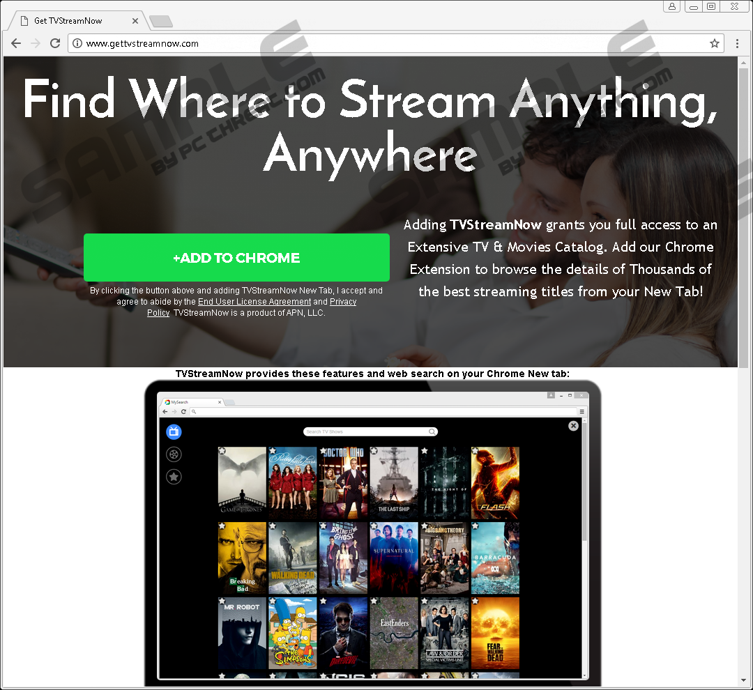 TV Stream Now New TabTV Stream Now New Tab is a browser extension that was classified as a browser hijacker that was designed to replace your browser’s homepage address with Search.mysearch.com. It is malicious by definition because it can replace the homepage address without your authorization or knowledge and, therefore, you should remove it. The reason for hijacking your browser in the first place is to make you use the featured search engine that collects information about you to show region-specific, personalized advertisements that generate revenue for its creators. Money talks, so it is possible for this hijacker to show shady and even malicious content that is unsafe and may cause you many problems. You can download TV Stream Now New Tab for Google Chrome and Mozilla Firefox Fromgettvstreamnow.com/lp4/. Furthermore, you can get it from the Chrome Web Store as well. If you download it from the website, then you will b asked whether you want it to change the homepage and new tab page addresses, but if you do not accept the offer, then you will not be able to get this extension. However, if you add this extension to Chrome from the Chrome Web Store, then it will not warn you about changing these settings and do that without your consent. These distribution methods are legitimate, but it is clear that you cannot get TV Stream Now New Tab without its featured search engine which is not supposed to be the center of attention, but it is because this extension does not do what it says it can. Officially, this application is said to offer you endless catalogs of streamed movies, but the reality is that this hijacker does not do anything of this sort. In reality, its only purpose is to replace your browser’s homepage and new tab page with Search.mysearch.com to make you use it to search the web. The search engine is functional, and you can use it like any other legitimate search engine. However, we are concerned with the possibility of this search engine featuring promoted links among regular search results. Its developers have to make money somehow, so it would not be surprising to see promotional links among the search results. Furthermore, some of the links could redirect you to shady, malicious websites that can subject you to downloads of malware or redirect you to fake online shopping websites and other scam sites. Also, it is worth mentioning that Search.mysearch.com and TV Stream Now New Tab may work together to collect information about you to customize and personalize the ads and promotional links you see while browsing the web. It should collect non-personally identifiable information only, and it includes your browsing history, entered search queries, geographical location, browser type, operating system type, and so on. The collected legally and could be used to bring you better content. However, due to the fact that TV Stream Now New Tab is a browser hijacker, do not expect it to deliver you any kind of quality service. All things considered, TV Stream Now New Tab is a useless browser extension that rightly deserves to be called a browser hijacker because its only purpose is to replace your browser’s homepage and new tab page address. Its search results can feature promoted links of unknown origin, so if you want to keep your computer safe, then we recommend that you remove TV Stream Now New Tab from your browser as soon as you can. Please see the guide below on how to delete it from your browser. Removal InstructionsGoogle Chrome