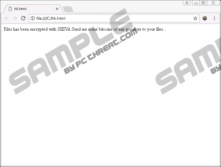 Shiva RansomwareShiva Ransomware is one of the latest discoveries of malware researchers at pcthreat.com. It was not a prevalent threat yet at the time of writing, but this might change soon, so you should not be so sure that it cannot enter your system. If Shiva Ransomware ever shows up on your PC, it will not necessarily encrypt your files because the version our specialists tested does not encrypt a single file. According to them, it is only a question of time when it is updated and starts encrypting all popular formats of pictures, documents, and other important files. If you are one of those lucky users whose files have not been encrypted after the successful entrance of Shiva Ransomware, we have only one piece of advice for you – delete the ransomware infection as soon as possible. In case you have found your files having the .shiva extension appended, it means that Shiva Ransomware has already affected them, but it surely does not mean that you should pay money to cyber criminals. You might be told that there is no other way to decrypt files, but it is not true. You could restore the encrypted data from a backup after erasing ransomware fully from your computer. Although Shiva Ransomware does not encrypt files, specialists have not made a mistake by putting it into the category of ransomware because the ransom note hk.html it drops on affected machines proves that all it wants from users is their money. It contains only one sentence: “Files has been encrypted with SHIVA Send me some bitcoins or say goodbye to your files....” As can be seen, cyber criminals behind Shiva Ransomware want money in Bitcoins, but, of course, you should not transfer your money to them on any account. Actually, even if you make a decision to make a payment, you might not be able to do that if the version encountered is the same our specialists analyzed because its ransom note contains only one sentence (see above), and it does not provide any payment details that are necessary to transfer the required money. Most probably, the updated version of Shiva Ransomware, i.e., the one that will encrypt users’ files, will include the BTC address and step-by-step payment instructions in its ransom note or, at least, leave an email so that victims could contact cyber criminals and get data decryption instructions. Needless to say, our experienced specialists do not recommend purchasing the decryptor/key from the creator of Shiva Ransomware because it might be completely useless. On top of that, there are no guarantees that you will get it even if you send Bitcoins as instructed. Ransomware infections are among the threats that do not need permission to enter users’ computers, so it is not at all surprising that so many users say that it has appeared on their PCs out of the blue. Specialists say that it is not easy to tell exactly how this threat is spread due to the fact that it has not affected many computers yet; however, according to them, it should travel the same as other ransomware infections. That is, it should be spread as an attachment in spam emails. These attachments are usually masqueraded as important documents, so many users, even those who are well aware of the fact that it is dangerous to open spam emails, get infected with the ransomware infection by opening such a “document” once. Of course, we do not say that it is the only way ransomware infections are distributed. Specialists say that ransomware infections might be available on dubious pages too, so carefully check all software you download from the web. Shiva Ransomware is not a threat that makes significant changes on compromised machines. Because of this, its removal should be quick and easy. You only need to delete all suspicious files you have downloaded recently and a ransom note hk.html from Desktop. We recommend using our manual removal guide if you have never deleted malware manually. If the manual method is not for you, you can erase malware from your PC automatically as well. Only one full system scan using a powerful scanner and you will no longer have any active threats on your computer. How to delete Shiva Ransomware