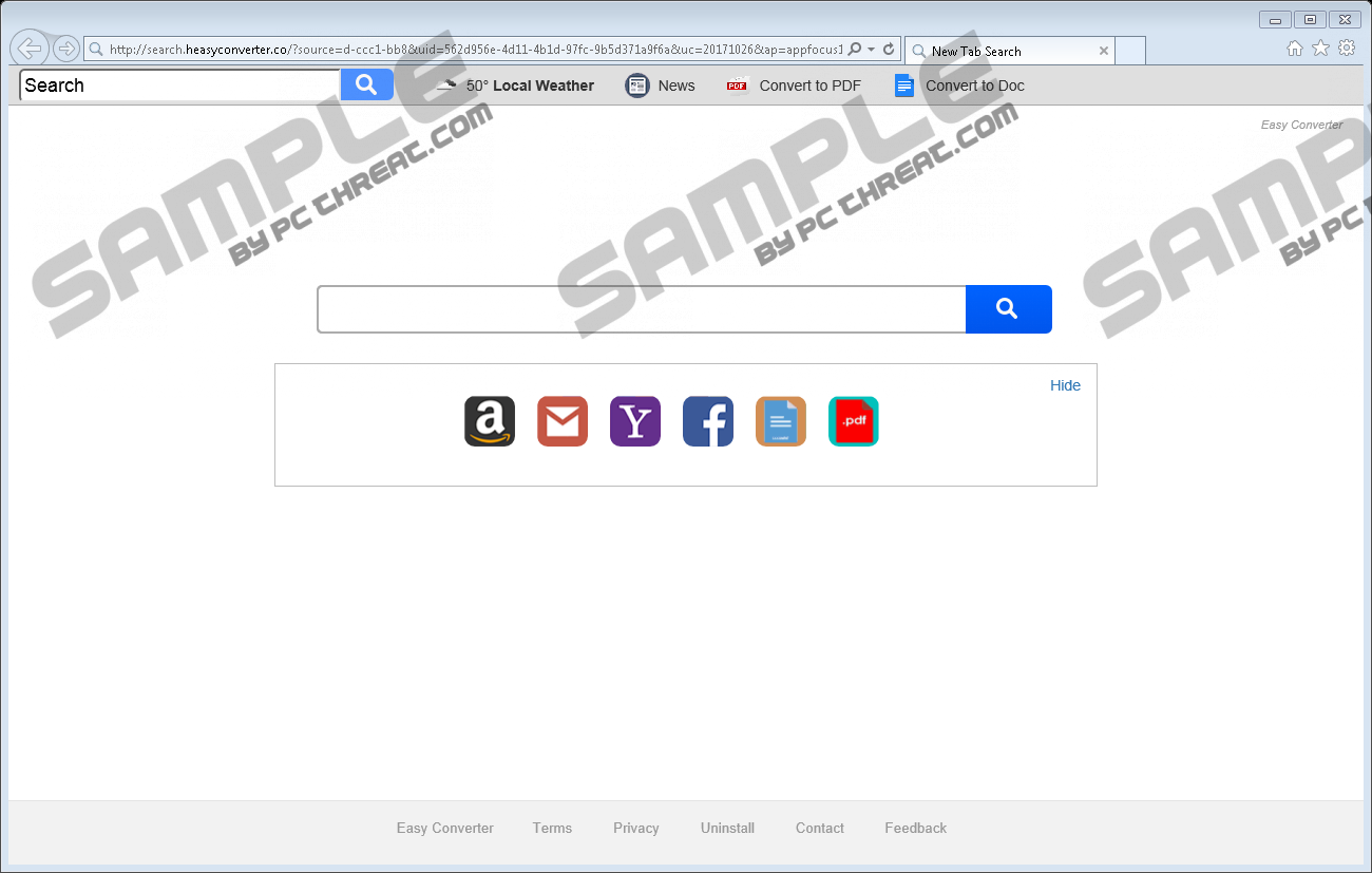 Search.heasyconverter.coIf you ever come across a program that goes by the name of Search.heasyconverter.co, make sure to avoid it at all costs. We urge you to do so because this application happens to be yet another browser hijacker that acts in an invasive manner. Upon intrusion, this invasive piece of software can make devious changes to your browser's default settings without any notification or authorization. In turn, your online activities become bothersome and frustrating, to put it lightly. What is even more concerning, is that in some instances, this hijacker could prove to be the primary reason other devious applications might gain easy access to your operating system with virtually no trouble at all. Read the rest of this article to have a better understanding how this dubious program functions. Besides such information, we also provide a removal guide that you should use to delete Search.heasyconverter.co once and for all. Search.heasyconverter.co is quite basic in its overall functionality. That is so because it makes changes to your browser's default settings in the same way that other applications of this classifications do. At the very same instance that it is installed on your computer, it makes devious and unauthorized changes to files and registry settings directly responsible for default settings of major browsers such as Google Chrome, Internet Explorer, and Mozilla Firefox. Such broad compatibility signifies the fact that this hijacker could affect virtually any Internet user. Therefore, it is critical to be aware of its existence at all times. All the mentioned modifications trigger changes of your default homepage and search engine. Due to these alterations surfing the web the way you are used to will be no longer possible. For as long as the hijacker in question will be fully active on your PC, you will be forced to use a devious search engine for every online query instead of the one you prefer. The same thing can be said about your default homepage since you will have no choice but to start your online session on a suspicious third-party website, whether you like that or not. It is not hard to imagine that your browser's functionality will be compromised. To restore your browser's default settings once and for all, you must delete Search.heasyconverter.co in its entirety. If you fail to do so, the invasive changes will continue to bother you on a daily basis. Terminate this browser hijacker with the help of your comprehensive removal guide. Because Search.heasyconverter.co is mostly distributed via bundled installers, it is quite natural that other dubious programs might enter your PC along with it. Thus, if you already have the hijacker in question on your PC, and you did not install it consciously, we highly advise you to analyze your entire operating system for other suspicious software. Unfortunately, there is another way that potentially harmful applications could enter your operating system. That could happen if you chose to use the questionable search engine set as your default one for your online queries. During the analysis, our malware experts have noticed that some results might host redirect links leading to sites created by cyber crooks. It is a dangerous instance because in some cases just landing on such a site could be more than enough to infect your PC. In other situations, you could come across fake online stores, which are created by cyber criminals for a single reason - to steal your credit card data. As you can see having Search.heasyconverter.co active on your computer could have devastating consequences, to put it lightly. If you value your virtual security, make sure to delete hits hijacker without any hesitation. To delete Search.heasyconverter.co quickly and easily, make sure to follow the instructions that we present below. Once you are done with them, make sure to double-check your entire operating system for anything linked to the intrusive hijacker. Such analysis is imperative because traces of Search.heasyconverter.co could prove to be quite invasive. There is a chance that leftovers could restore the hijacker silently. In some cases, traces could be just enough for Search.heasyconverter.co to continue its suspicious functionality. Another way to be sure that every single bit of this dubious program has been removed from your PC is by scanning your operating system with a professional antimalware tool because it is designed to detect and delete any virtual threat automatically. How to remove Search.heasyconverter.co from your PC