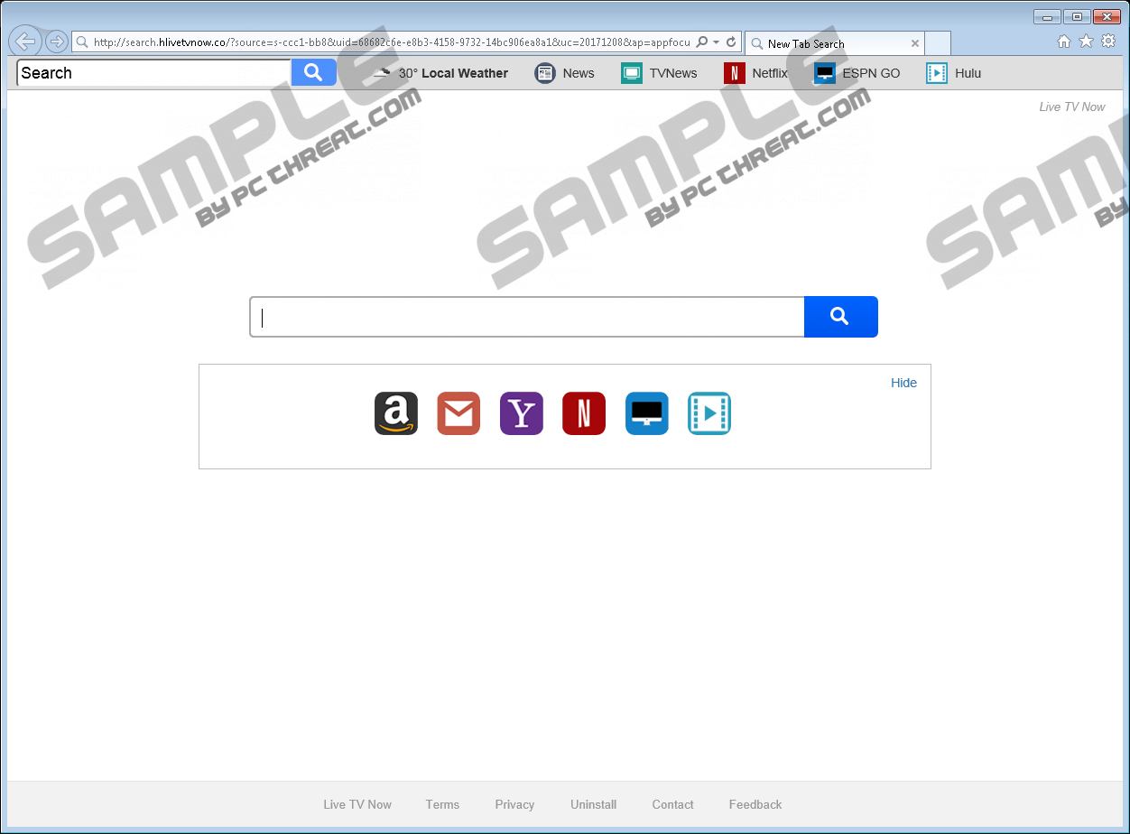 Search.hlivetvnow.coIf you have noticed a sudden change in your browser's default settings, it might be an indication that a browser hijacker is active on your PC. One such application goes by the name of Search.hlivetvnow.co. If you ever happen to come across this devious program, make sure to refrain from it at all costs. It is critical to do so because this invasive application can make browsing the web a much more annoying and frustrating task. Furthermore, you must be aware of the fact that due to this suspicious program, your operating system could be put in danger. In turn, other suspicious programs could enter your PC without a lot of trouble. If you want to find out how this hijacker works, make sure to read the rest of this report. Below, we also include a detailed removal guide, which will help you delete Search.hlivetvnow.co once and for all. Search.hlivetvnow.co is one more browser hijacker, which is fully compatible with major web browsers such as Mozilla Firefox, Internet Explorer, and Google Chrome. Due to such broad compatibility, an enormous amount of users could be affected by this hijacker. Therefore, our malware experts highly advise you to be aware of this malware so you could keep your PC safe and secure at all times. The basic functionality of this dubious program does not differ all that much from other hijackers that are active nowadays. As soon as it gains access to your operating system, it immediately makes changes to the mentioned browsers' files and registry entries. Because of such functionality, you will notice an alteration of your default homepage and search engine. Unfortunately, you are not notified or asked to authorize these modifications. At first sight, these changes might not seem like a big deal; however, that is not entirely the case. Basically, for as long as this hijacker will be active on your PC, you will have no choice but to start your online session on a suspicious third-party site. Also, you will be forced to use a search engine for all your online quires. What makes matters even more annoying, is the fact that in some instances the search provider in question could present you with sponsored results instead of useful ones. Due to all of this, you will no longer be able to surf the web the way you like. Make sure to remove Search.hlivetvnow.co because that is the only way to restore your web browser's default settings. While frustration caused by Search.hlivetvnow.co is a reason enough to remove it without any hesitation, it is critical to note that it could subject your operating system to suspicious and sometimes harmful web content. We advise you not to use a suspicious search engine since some of its results could lead to devastating outcomes. That is so because some results could host redirect links, which might lead you to suspicious and even malicious sites. For example, you could encounter fake online stores. It is critical to note that cyber crooks craft such devious shops to steal your credit card data or other sensitive information. In other cases, you might end up on web pages created by malware developers and just entering them could be more than enough to infect your personal computer with some unknown malware. Thus, if you already have Search.hlivetvnow.co active on your PC, make sure to check your computer for any potentially dangerous programs. While results implemented with redirect links do not occur often, coming across one remains a possibility, which should be taken seriously. If you want to keep your computer safe and secure at all times, be sure to delete Search.hlivetvnow.co at the very same instance that it is found active on your operating system. The removal of Search.hlivetvnow.co should be your utmost priority if you ever discover it active on your personal computer. Delete it without encountering any major problems by following the detailed instructions below. It is critical to remove everything linked to Search.hlivetvnow.co because its traces might act deviously. There is a chance that just a few leftovers could be used to restore this browser hijacker. In other situations, traces might be enough for undesirable changes to remain in place. To be sure that the removal of Search.hlivetvnow.co has been successful, make sure to recheck your entire operating system for anything associated with it as soon as you are done with the removal guide below. How to remove Search.hlivetvnow.co from your computer