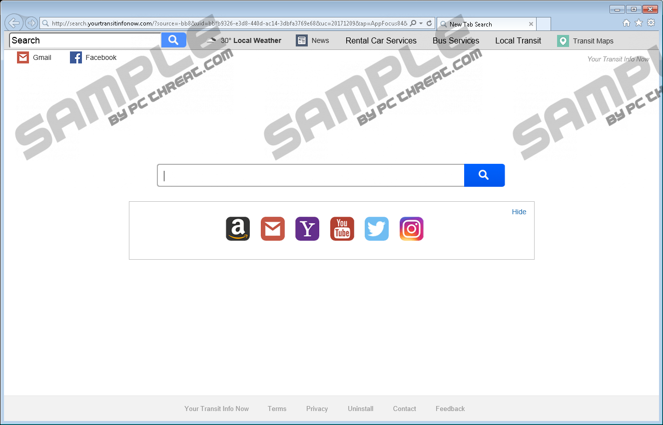 Search.yourtransitinfonow.comSearch.yourtransitinfonow.com is a new questionable search website with a fake toolbar offering easy access to pages associated with traveling. Unfortunately, this featured search website can show up in your browsers uninvitedly and pose a threat to your virtual security. In fact, we have found that this is yet another useless browser hijacker from Polarity Technologies Ltd., which is also responsible for dozens of other threats like Search.searchlcll.com and Search.searchtpg.com. These hijackers are very similar to each other and at times even identical clones of each other the only difference being the URL address. This browser hijacker can affect your Mozilla Firefox, Google Chrome, and Internet Explorer browsers. This means a lot of surface for exposure to potentially unreliable third-party content. It is possible that you will be presented with modified search results that could contain risky third-party ads and links leading to malicious webpages. Thus, we recommend that you act now and remove Search.yourtransitinfonow.com from your computer. When you find this browser hijacker active in your browsers, it is possible that you have clicked on a corrupt third-party advertisement or link, installed a freeware bundle, or your computer was already infected with malware that displayed the corrupt ad for you. As you can see, you need to be extra careful while surfing the web because you can easily infect your computer by simply clicking over the wrong content. If you click on an unsafe third-party banner or pop-up ad, a fake button, or other corrupt content, you may either directly install this hijacker in your browsers or open new tabs with malicious pages that may scam you to install it. There is also a chance that you will not only install this threat alone but a whole bundle of potential and malicious threats and this is why it will not be enough for you to delete Search.yourtransitinfonow.com alone. You may also tend to download free video files and programs via suspicious torrent and freeware sites like descargar.es and filewon.com. But you should know that such P2P sites usually promote questionable (to say the least) software packages. This means that even when you think that you are downloading a standalone file, it is always a bundle indeed. This bundle may carry potentially unwanted programs and malware infections as well in addition to a possibly legitimate free program. As a matter of fact, this is how a lot of unsuspecting computer users infect their system with adware programs, browser hijackers, Trojans, ransomware programs, fake alerts, and more. We recommend that after you delete Search.yourtransitinfonow.com from your browsers, you use a reliable malware scanner to detect all other threats on your computer. This new search page provides you with the usual fake toolbar and basic easy access links (News, Local Weather, Gmail, and Facebook) as well as third-party pages associated with traveling, including car rental services and bus services. Although these are mainly legitimate websites, they may display third-party advertisements that could be manipulated by this hijacker. But the worst thing is the search engine itself because it may show you manipulated search results on a Yahoo results page. Landing on a Yahoo page would obviously make you feel like you can trust what you see there. This is however a trick because this browser hijacker may inject unreliable third-party ads and sponsored links to promote affiliates and thus make money. However, clicking on such content may harm your computer and your bank account as well if you were to land on a scamming pages, for instance. This is why we believe that you should remove Search.yourtransitinfonow.com right away. To eliminate this browser hijacker, it may be enough for you to reset the homepage setting in the affected browsers since this malware infection is mostly known to change that. Please use our instructions below for reference if you do not know how to do this. Remember that you cannot leave other possible threats on board either. You need to remove all of them manually or use an automated security tool you can trust, such as SpyHunter, to do this hard work for you. Having an anti-malware program installed would also give you the best protection for your PC against future threats. Remove Search.yourtransitinfonow.com from your browsersGoogle Chrome