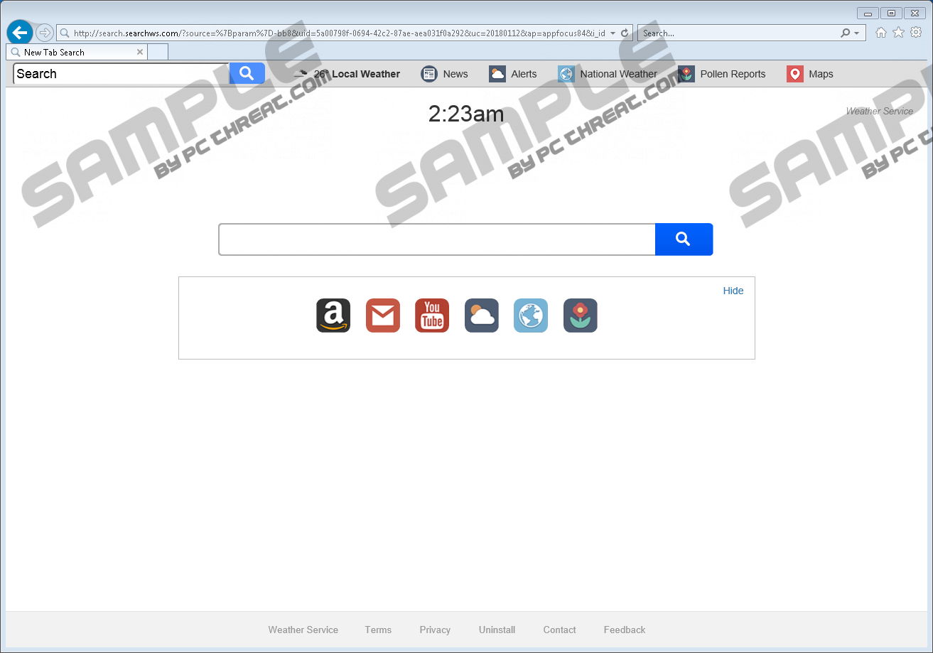 Search.searchws.comIf you are wondering why your browser's default settings were altered without any authorization, you should know that it could be an indication that a browser hijacker is active on your operating system. One such application goes by the name of Search.searchws.com. If you ever encounter it, be sure to avoid it at all costs as it exhibits extremely invasive functionality. Just like any other suspicious program of this classification, the one in question can make browsing the web an annoying and frustrating experience by initiating undesirable alterations to your browser's default settings. Unfortunately, there is more to this hijacker than you might think. Upon further analysis, it has been discovered that this devious piece of software could act dangerously. To find out more about its suspicious functionality, be sure to read our report. Finally, to help you delete Search.searchws.com, we include a comprehensive removal guide that you can find below. During the extensive analysis of Search.searchws.com, our researchers have noticed that this browser hijacker affects major web browsers such as Google Chrome, Internet Explorer, and Mozilla Firefox. Due to such broad compatibility, a large number of users could be affected by this dubious application; thus, being aware of its existence could help you keep your operating safe and secure. The first indication that Search.searchws.com is up and running on your personal computer is a sudden change of your browser's default settings. The main two alterations are of your homepage and search engine. They are triggered in a somewhat conventional manner; upon intrusion, this hijacker makes modifications to a few files and registry values that are directly related to your browser's default settings. Due to all of that, surfing the web will become a much more bothersome task. That is so because for as long as this hijacker will be active on your personal computer you will start all of your online sessions on a questionable third-party site, whether you like that or not. Furthermore, you will experience the same thing in regards to your search engine as you will be forced to use it for every single online query. What causes even more annoyance is the fact that the newly appointed search provider can present you with a large number of sponsored results, which might have nothing to do with your online query. It is critical to delete Search.searchws.com as that is the only way to regain your browser's default settings. To do that quickly and easily, make use instructions that we present below. It is critical to note that Search.searchws.com could prove to be just as dangerous as it is annoying. As it turns out, the newly appointed search engine could present you not only with worthless results but with ones hosting redirect links. If you happen to click on such a result, you could find yourself on suspicious and even malicious websites. There is a chance that you could come across hoax online stores, which are set up by cyber crooks for a simple reason - to steal your credit card data and other sensitive information. Furthermore, you could end up on a webpage that runs something known as an arbitrary code execution exploit, which malware developers favor because it can initiate a remote installation of some devious or malicious program without requiring your consent. Thus, just entering a site that runs the exploit in question could have disastrous outcomes. As you can see this hijacker cannot be trusted and should not be tolerated as it might prove to be a major virtual threat. Be sure to execute a complete removal of Search.searchws.com as soon as it is found up and running on your operating system. To remove Search.searchws.com once and for all, make use of our detailed instructions. As soon as you are done with the manual removal, be sure to recheck your entire operating system for potential leftovers. Such analysis is imperative because just a few leftovers of Search.searchws.com could act deviously. For example, some traces might be just enough for the dubious alteration to remain in place. In other instances, leftovers might trigger a restoration procedure of Search.searchws.com without your knowledge. If you find manual analysis a bit too complicated, make sure to scan your computer with a reliable antimalware tool because it can identify and delete any virtual security threat automatically. How to remove Search.searchws.com from your PCInternet Explorer