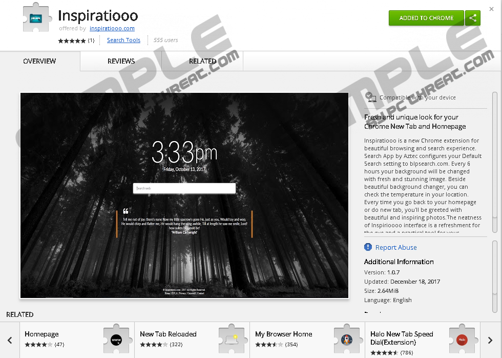 Inspiratiooo.comBrowser hijackers are extremely annoying and can be quite dangerous as well. Malware experts at our internal labs have discovered one more application of this classification, which is known as Inspiratiooo.com. Thus, if you ever encounter it while browsing the web, make sure to do everything in your power to avoid it at all costs. Doing so is critical because this piece of software is infamous for its ability to make changes to your browser’s default settings without a lot of trouble. On top of that, this hijacker could act rather dangerously since it might subject your operating system to suspicious or even malicious web content. Find out how that could happen by reading the rest of this report. Additionally, we present a detailed removal guide, which you should use to delete Inspiratiooo.com if it is ever found up and running on your operating system. During the initial investigation, malware experts at our internal labs have discovered that Inspiratiooo.com does not differ all that much in its functionality from other browser hijackers that are active nowadays. However, it only affects the Google Chrome web browser, at the moment. If you happen to use a different browser, you should still be aware of this hijacker existence since its developers could launch its updated version, which might affect other popular browsers. Once Inspiratiooo.com enters your operating system, it immediately installs a suspicious third-party browser extension, which is used to make undesirable alterations to your browser’s default settings. This intrusive piece of software alters your default homepage and new tab page without your consent. These seemingly irrelevant changes will make your online experience annoying and frustrating, to put it lightly. That is so because you will be forced to use a suspicious third-party webpage as your homepage each time you will start an online session. Also, the modification of your new tab page will cause extra annoyance because for as long as this hijacker will be active on your operating system, you will be presented with a suspicious third-party site, instead of a blank page that you are used to. It should be self-evident that such functionality of this invasive application must not be tolerated. If you wish to browse the web the way you are used to once again, you need to remove Inspiratiooo.com once and for all. Do that in just a few simple steps, make sure to use the detailed instructions that we present below. Unfortunately, annoyance caused by Inspiratiooo.com is not the worst thing about it. It is essential to note that this hijacker could be distributed via bundled installers, which could prove to be dangerous. That is so because such setup files are infamous for hosting suspicious and even malicious programs. Therefore, our researchers highly advise you to check your operating system for other dubious applications if you already have the hijacker in question running on your computer. Also, you must know that using a questionable search field on a newly appointed homepage might be dangerous. As it turns out, some results could be hosting redirect links that could lead you to dangerous websites. For example, you could end up on a webpage that runs an arbitrary code execution exploit. Just entering such a site could be enough to infect your operating system with some unknown malware because the exploit in question can initiate a remote installation procedure without requiring your consent. Also, you could be redirected to fake online shops. Such devious online stores are set up by cyber crooks so they could steal your credit card data or other sensitive information. As you can see, this browser hijacker could prove to be a major virtual security threat. Do not take any chances and thoroughly remove Inspiratiooo.com from your operating system once and for all. The removal of Inspiratiooo.com should be executed without any hesitation. Do that in just a few simple steps by using the instructions below. Keep in mind that a single mistake during the termination procedure could result in an incomplete removal. In such a case, traces of Inspiratiooo.com could remain active on your PC. You must know that just a few leftovers could be used to restore this hijacker without your knowledge. Furthermore, those same traces might be just enough for it to continue working. If you want to be sure that every single bit associated with Inspiratiooo.com has been removed from your PC, make sure to double-check your entire operating system for anything associated with it, as soon as you are done with the instructions below. How to remove Inspiratiooo.com from your PCGoogle Chrome