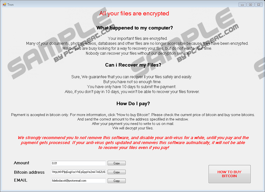 Tron RansomwareTron Ransomware could cause a lot of trouble as the malware is capable of locking user’s private files with a secure cryptosystem. As you see the data that gets encrypted can no longer be opened as the computer cannot recognize it. Unfortunately, it might be impossible to restore it as the only tool capable of it is probably available only to the malware’s developers. The other way to restore locked files is to switch them with copies from backup storages. Thus, if you were lucky enough to make a backup before the system got infected with this infection, you should be able to get your data back. Users who do not have this option may consider paying a ransom asked by the hackers behind Tron Ransomware, but we would advise against it as it is extremely risky. To find out more about this malicious program we recommend reading this article. Users who decide not to risk their savings can also find our prepared deletion instructions located below; they will show how to eliminate this malware manually. Before we start talking about how Tron Ransomware works or encrypts user’s data and what it does, later on, we would like to discuss the ways it could enter the system. The most popular distribution channels for such threats are no doubt Spam emails and unprotected RDP (Remote Desktop Protocol) connections. This is why to keep the computer secure it is essential to avoid suspicious email attachments coming from people you are not familiar and to replace weak passwords. In addition, our researchers would advise updating outdated software, including the computer’s operating system and antimalware tool. Programs that are not up to date can have known vulnerabilities which hackers could use to gain access to the system and drop malware on it without the user even realizing anything. Another good idea would be to stay away from malicious file-sharing web pages or other potentially-dangerous websites, advertisements, etc. Nonetheless, if the malicious program enters the system, it might do quite a bit of damage. First of all, Tron Ransomware should check users IP address and then locate all targeted files. Our researchers say the infection is mostly after user’s private data, for example, pictures, photos, videos, various documents, etc. All of these files should be locked while using a secure cryptosystem. What’s more, during this process each affected document, photo, or any other file should gain a second extension visible at the end of the title, for example, panda.jpg.tron, myspeech.docx.tron, and so on. Therefore, it is not to difficult to recognize ruined data as it only takes to take a look at its title. After encrypting al targeted files, Tron Ransomware should open a warning message titled Tron. It starts with “All your files are encrypted” and continues with instructions on what to do to restore locked data. For instance, the message claims the files can be restored only in the following ten days and to do so the user is asked to pay a ransom. No doubt, this message is a ransom note written by the malware’s developers. Naturally, users who have no options for data recovery could consider complying with the stated demands and paying the ransom. However, just as we said earlier, we do not advise it. The reason for it is the hackers cannot be trusted; not to mention, there is no way of getting your money back even if your data does not get decrypted. We do not say you will necessarily get scammed, but given you would be dealing with people who make a living by constantly ruining someone’s files and extorting money from users, we believe it quite likely to happen. Consequently, we advise not to trust Tron Ransomware’s developers and get rid of the malicious program instead of paying the ransom. If you think this is the best thing to do as well, we encourage you to use the deletion instructions located a bit below. Also, users who think these steps are a bit too complicated can use a reliable antimalware tool too. Remove Tron Ransomware