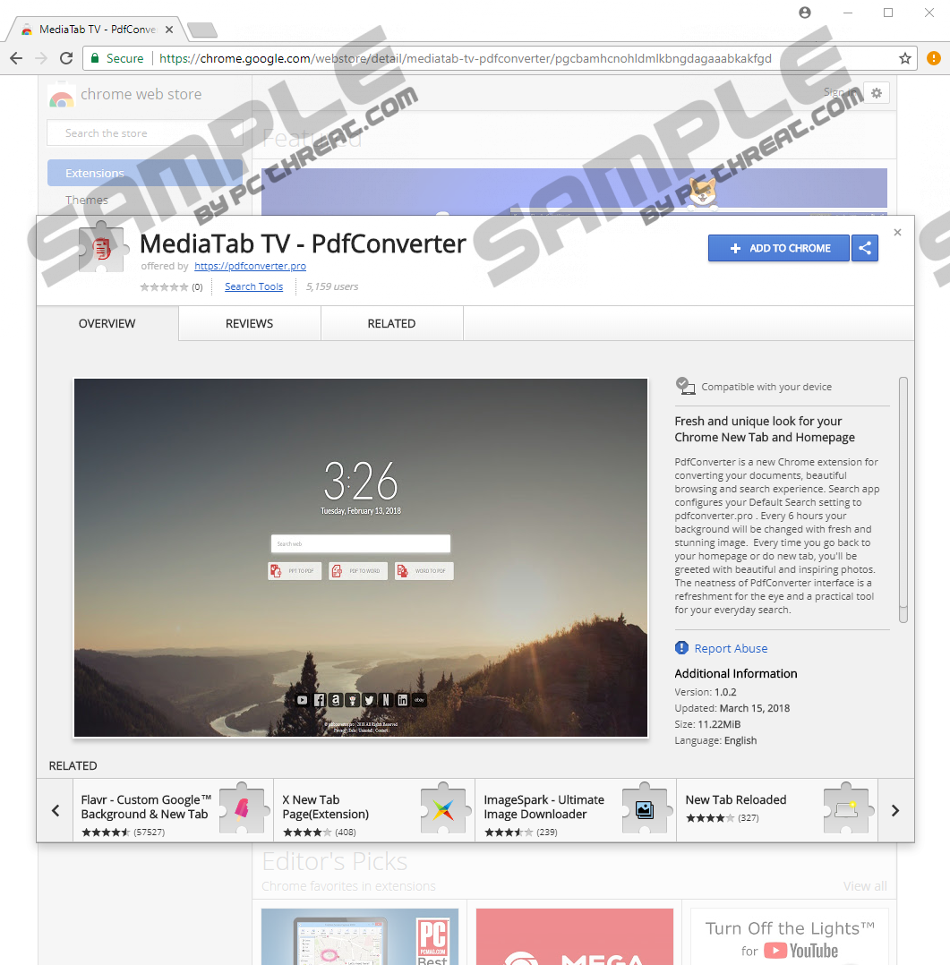 Pdfconverter.proIf both your New Tab and homepage have been changed to Pdfconverter.pro, you must have installed the Google Chrome browser extension from https://chrome.google.com/webstore/detail/mediatab-tv-pdfconverter/pgcbamhcnohldmlkbngdagaaabkakfgd. If you are sure you have nothing to do with this, it could have affected your browsers without your knowledge. Either way, our security specialists recommend that you remove the MediaTab TV – PdfConverter extension if you want to get rid of the page set. This is the only way to do this, so take action immediately after you read this article. This piece of software is promoted as a “new Chrome extension for converting your documents, beautiful browsing and searching experience,” but we still cannot let you keep it because it has been categorized as a potentially unwanted program, meaning that it is not fully reliable. You will find more about this Google Chrome extension if you continue reading this article. It is very likely that you will decide to get rid of this extension after reading this report, so we have prepared the manual removal guide for you. The installation of MediaTab TV – PdfConverter will result in altered settings of Google Chrome. To be more specific, you will find both your homepage and New Tab altered. Pdfconverter.pro contains a search box and three quick-access buttons (PPT TO PDF, PDF TO WORD, and WORD TO PDF) that all open a third-party file conversion service (https://smallpdf.com/). As for the search provider, we cannot guarantee that all search results you will be presented with after entering a search query will be 100% trustworthy too. There is a possibility that some sponsored links will be displayed to you either, so, in our opinion, it would be smarter to perform web searches using another search provider that is 100% reliable. The online file converter promoted by Pdfconverter.pro can also be accessed without its help. You could access and continue using it after removing the potentially unwanted program by simply typing its URL in your browser’s URL bar and pressing Enter. If you keep Pdfconverter.pro set on the web browser you use, it will also automatically collect various details. Researchers working at pcthreat.com have analyzed its Privacy Policy to find out what details it records. It has turned out that both non-personally identifiable and personal information will be recorded. Speaking specifically, it records IP address, the type of browser used, the time at which the website is visited, and third-party pages visited through Pdfconverter.pro. As for the information that can identify users personally, all personal details provided by the user voluntarily will be recorded. Potentially unwanted applications are not real threats, but you should not let them record any details that can identify you personally because there is a possibility that they will all be used for various malicious purposes in the near future. It must be one of two reasons you see Pdfconverter.pro set on your Google Chrome browser. You have either installed this browser extension directly from the Chrome Web Store yourself, or it has been installed on your computer without your knowledge. Potentially unwanted programs are often spread bundled, so there is a possibility that you have installed MediaTab TV – PdfConverter together with other programs that are not associated with it in any way too. Keep in mind that this piece of software is the same potentially unwanted program no matter it has been installed from the Chrome Web Store or has appeared on your system out of the blue. In other words, we suggest that you remove it no matter what. No, it is not a harmful infection, but we are sure there are better applications with similar features available, so you should use one of them instead. Pdfconverter.pro is a website that will be set on your browser as a homepage and New Tab if the browser extension promoting it is ever installed on the system. It is not harmful malware, we can assure you, so its removal should not be complicated. In fact, you just need to remove this extension using your browser’s add-ons manager. You can find our step-by-step instructions provided below. Feel free to use them. Delete Pdfconverter.proGoogle Chrome