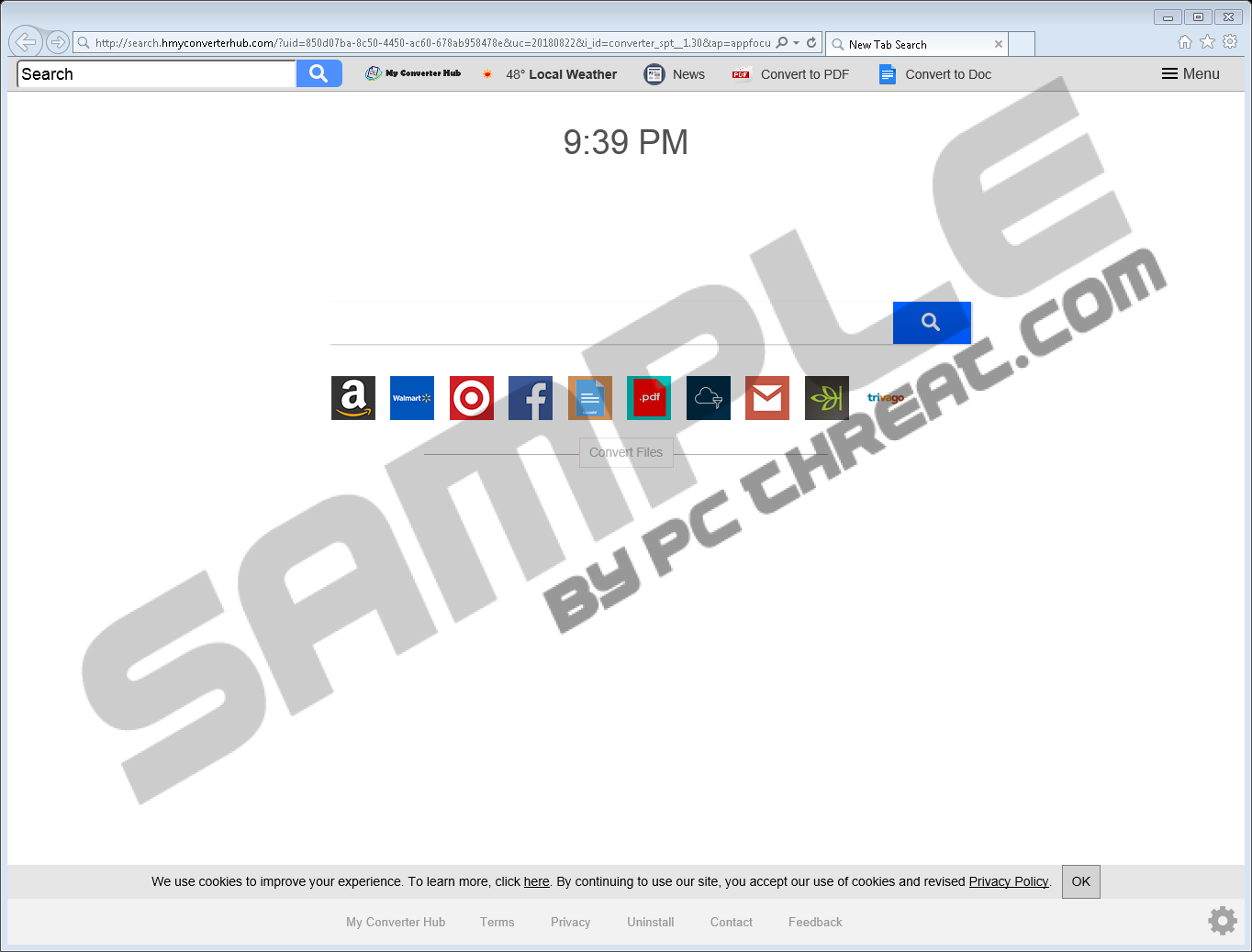 My Converter HubMy Converter Hub may not be the worst cyber nightmare, but you still shouldn’t keep this application on your browser. Our research team says that this application is a browser hijacker, and it means that it modifies your browser’s settings without your permission. It requires your permission to be added to your browser, but you may not be aware of the fact that you allow this program to enter your system. Either way, now that you know this application is undesirable, it is time to remove My Converter Hub for good. Please scroll down to the bottom of this description for the manual removal instructions. To tell you the truth, we’ve seen many applications from the same group before, and all of them come with a specific function that should improve your overall web experience. My Converter Hub belongs to the same group of potential security threats as Search.youremailnow.com, Search.yourclassifiedscenter.com, Search.yourinterestscenter.com, and others. So it might seem like a new program on the surface, but deep down it follows the same pattern as its predecessors, and it probably enters most of the target systems unexpectedly. It might look that this program can offer you something good, but you should definitely think twice before installing this application. If we were to take a closer look at My Converter Hub and its official website, the program would make an impression that it really tries to enhance your computer experience, especially if you tend to work with different file formats all the time. Mycoverterhub.com claims that this application can help you convert all sorts of files into the PDF format, thus making your life easier. And sure, if that’s what you’ve been looking for, the idea that you have finally found a good file converter can be quite appealing. Nevertheless, most of the time, this application arrives when the user expects it the least. Why does that happen? This usually happens because the official homepage isn’t the main distribution source. My Converter Hub usually comes through random pop-ups that users encounter on ad-friendly websites, and other pages that host freeware. Also, they might be bundled together with freeware applications that users download from file-sharing websites. This type of distribution method does not give the program a 100% guarantee that it will be installed on the target computer, and the user can always choose to skip the step that adds My Converter Hub to their browser. However, most of the users fail to notice that step or they simply do not think twice before clicking the Add button. The moment this application is added to the default browser (which can be Chrome, Firefox, or Internet Explorer), it changes the homepage and default search engine settings. Interesting, isn’t it? The program says that it is there to help you convert your files into PDFs, but it also meddles with your browser’s settings. What’s more, it clearly employs tracking cookies to collect information on your web browsing habits. So after a while, My Converter Hub will know which websites you frequent and what you usually search for online. This information is collected in order to generate custom advertisements while you browse the web. My Converter Hub and other similar applications make money whenever you click those advertisements. While this type of scheme inherently is not malicious, you can never know what awaits you behind a third-party link, so it is not safe to continue clicking these ads. Not to mention that My Converter Hub also tends to redirect you to a modified Yahoo! Search engine page, where it displays customized search results. In short, there are a lot of security issues associated with this application, and you should not tolerate that. You can remove My Converter Hub via Control Panel, but then you would only delete this extension from Internet Explorer. You need a separate removal method for Chrome and Firefox. Check out the removal instructions below to terminate the browser hijacker, and then get yourself a security tool that would locate other potential threats. If this program entered your PC in a software bundle, you definitely have more unwanted applications installed. So do not stop until your computer is safe and clean again. For more questions, feel free to drop us a note in the comment box below. How to Remove My Converter HubInternet Explorer